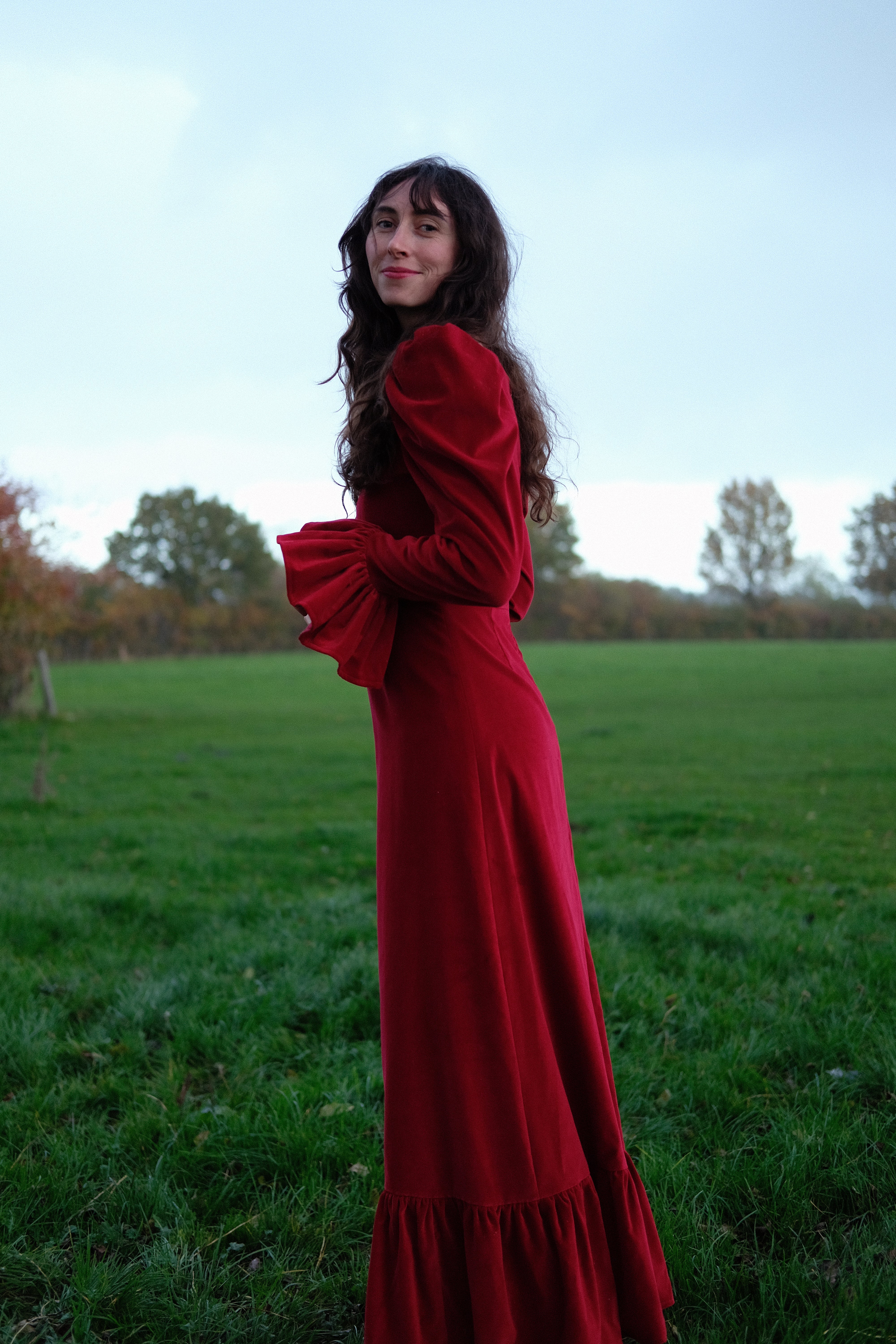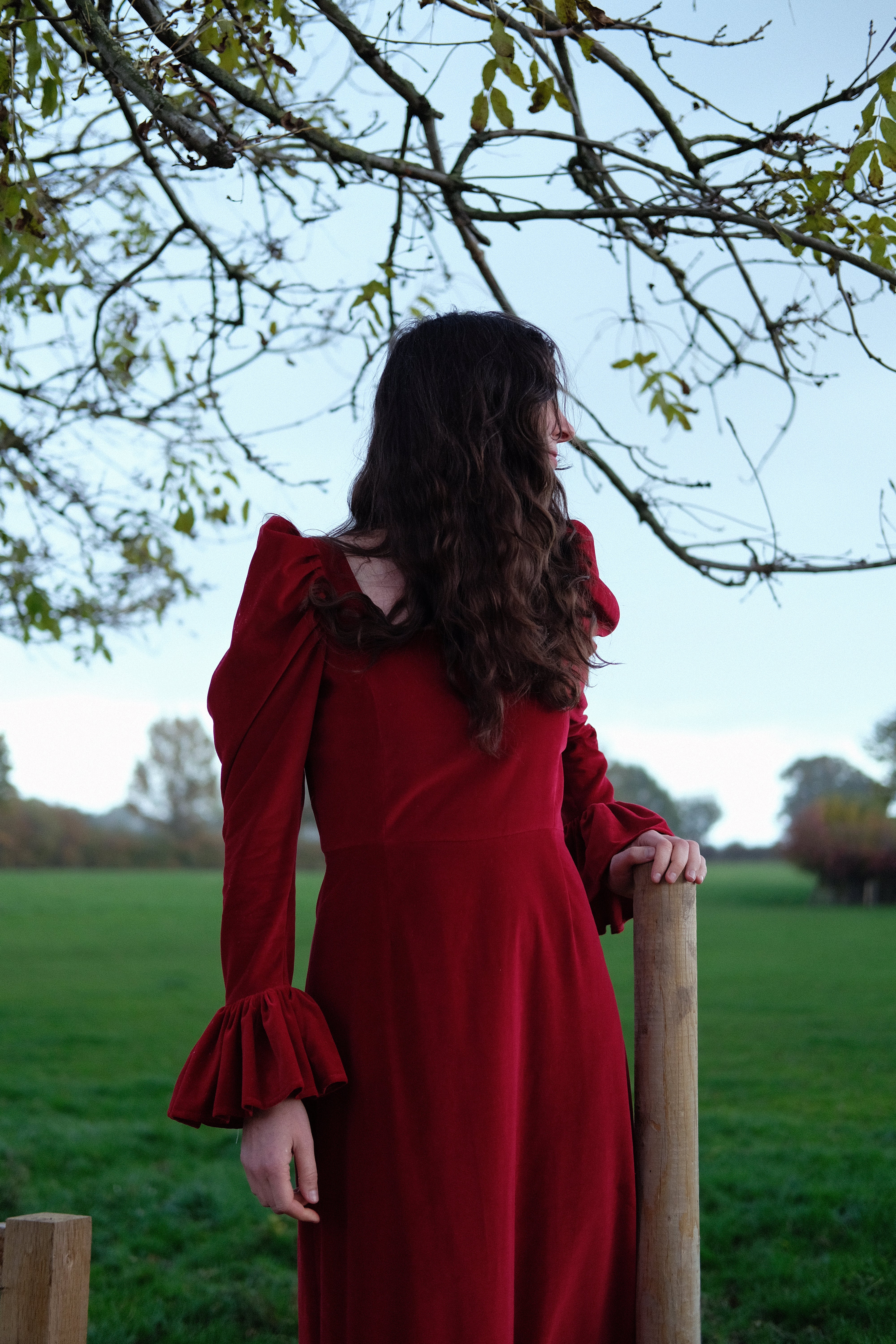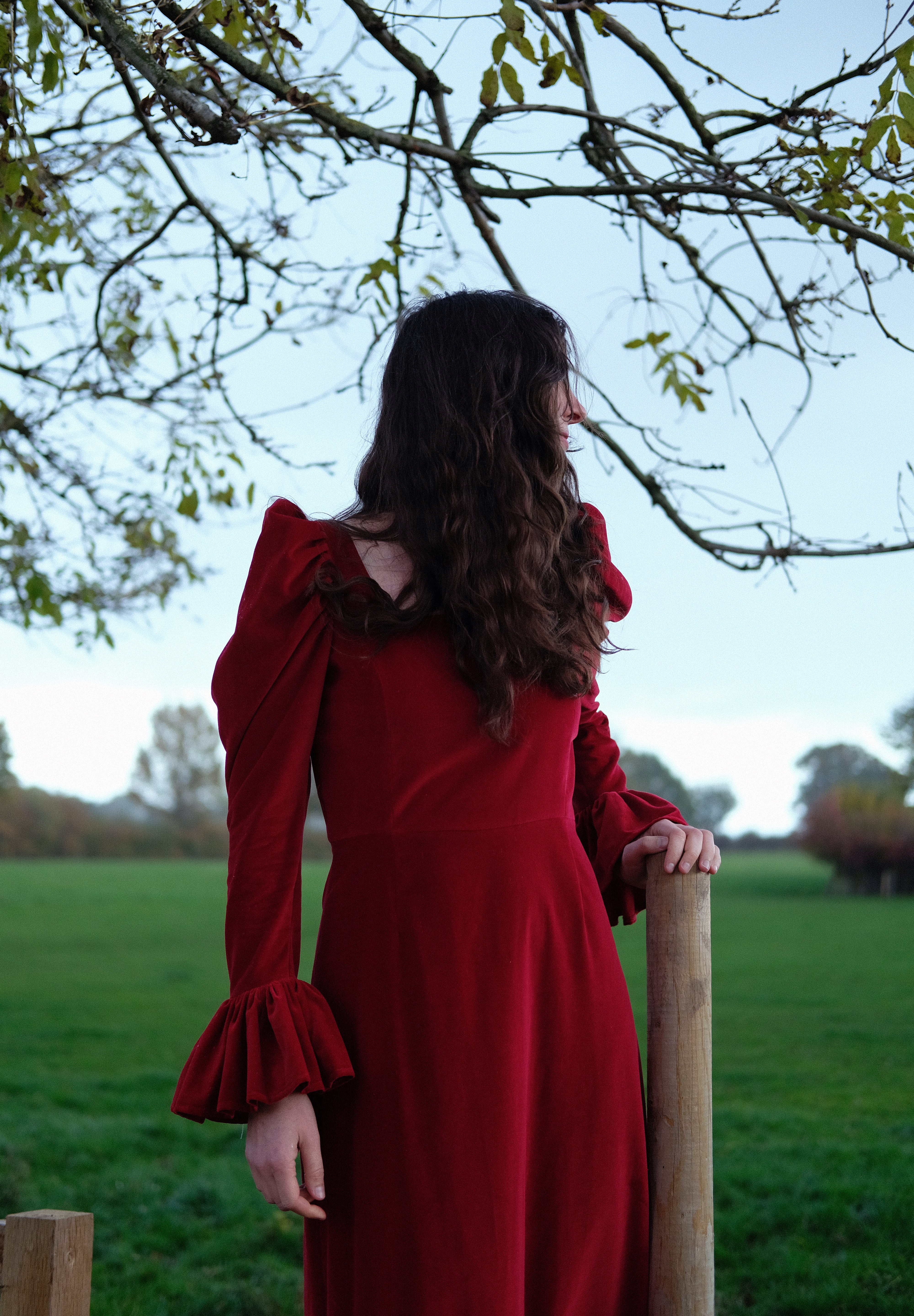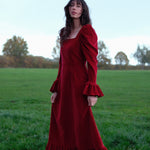 Crafted from sumptuous cotton velvet, it embraces you in softness while allowing you to move freely and comfortably. The square neckline and fitted bodice channel vintage charm, while the A-line 100cm long skirt flows gracefully with delicate flounces, making every step feel like magic.