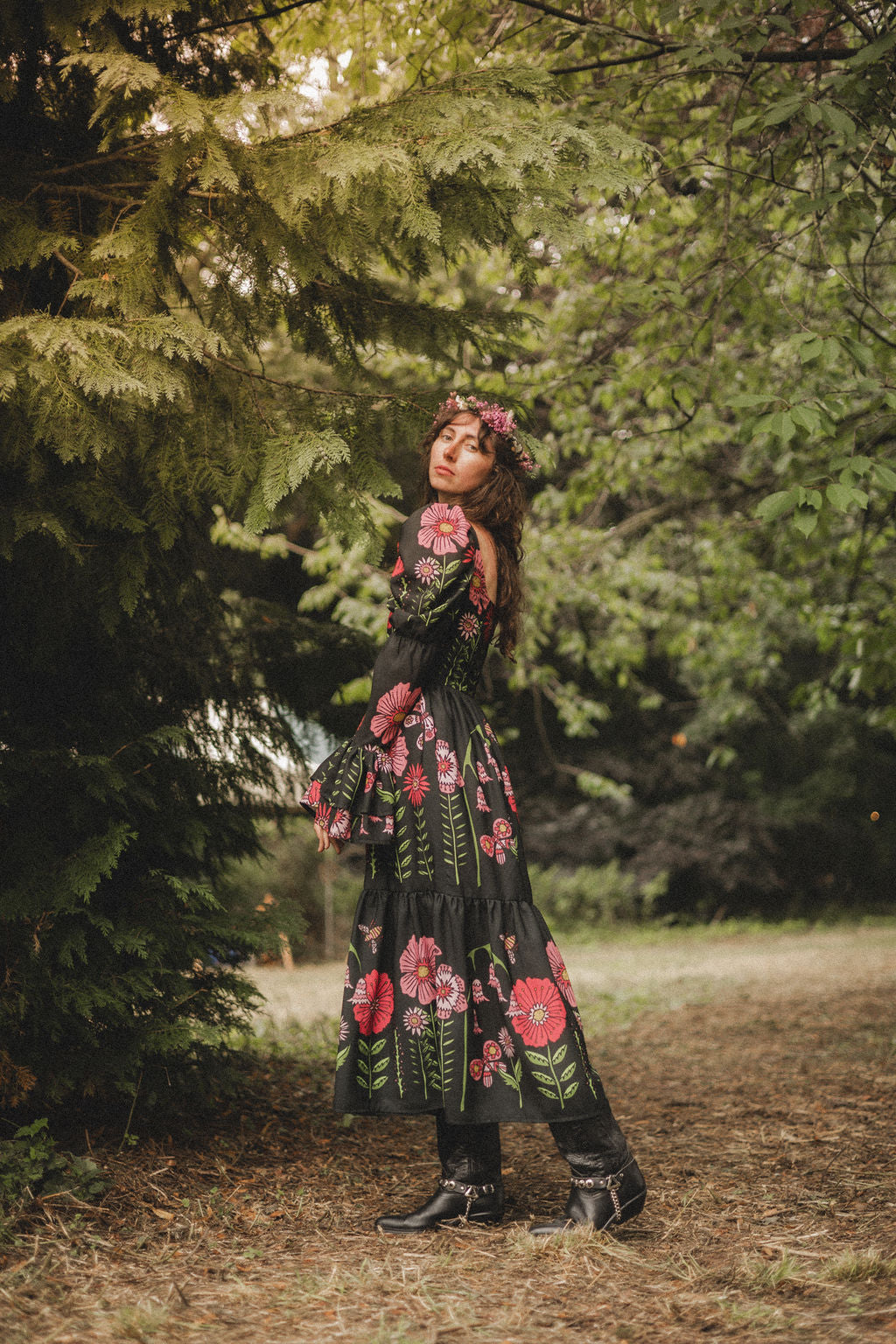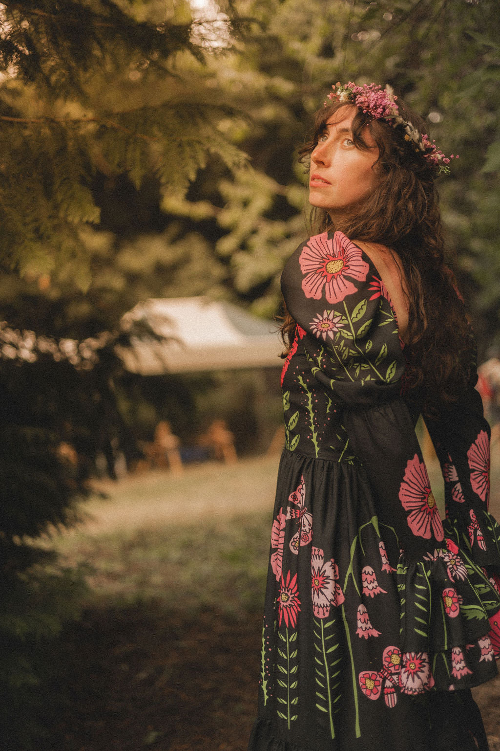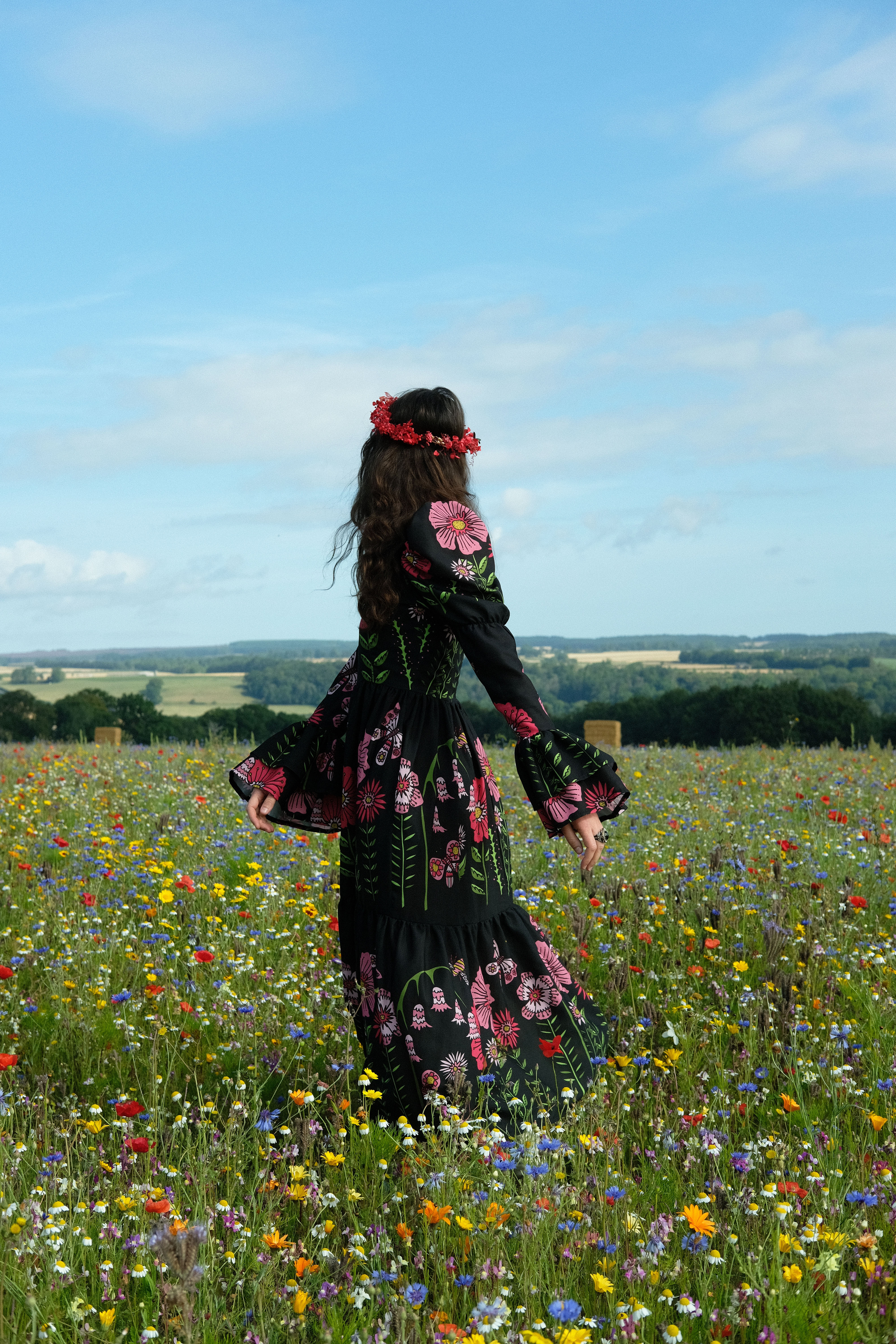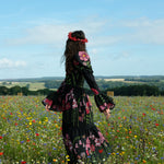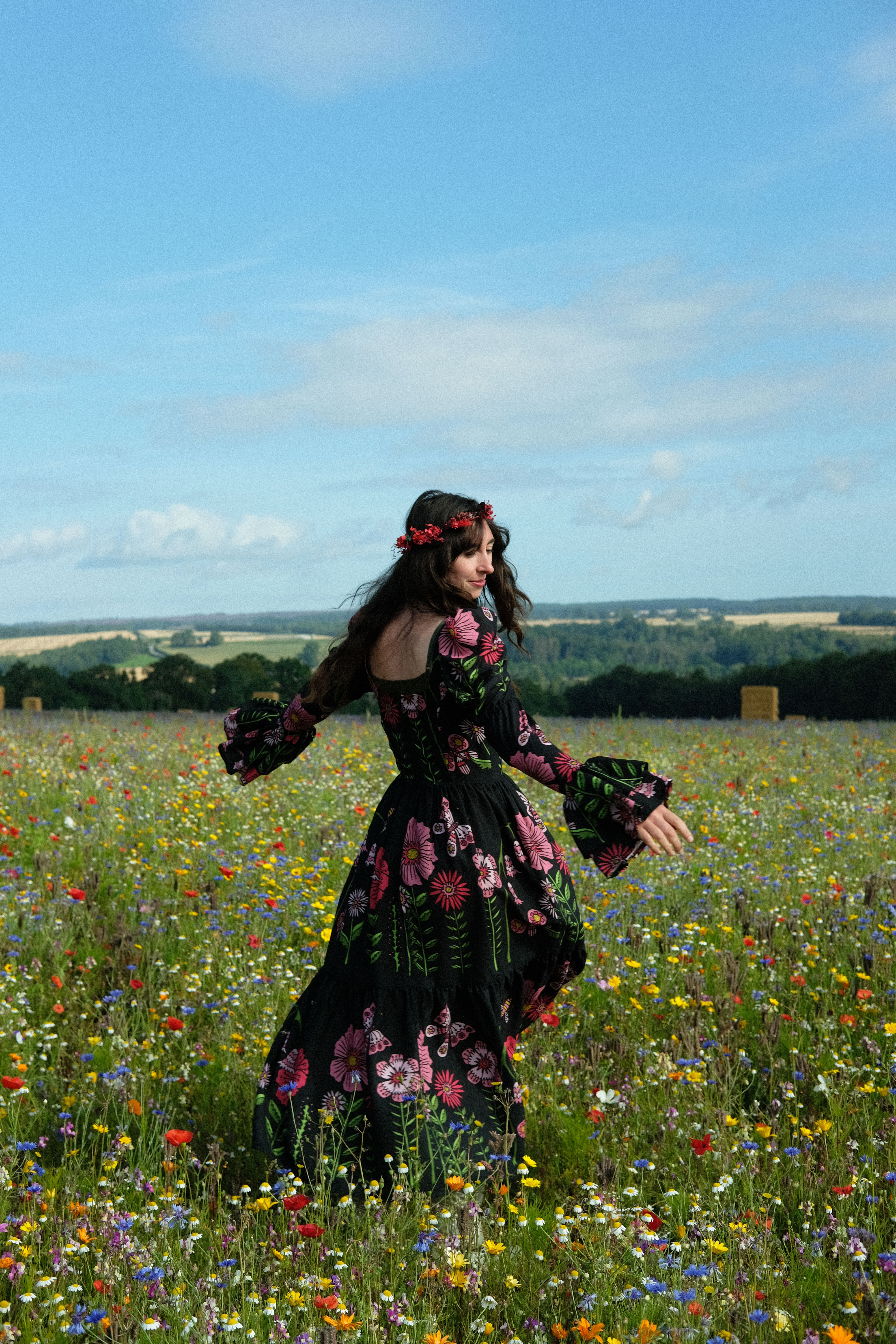 Jolene, a dress crafted with passion and artistry. This limited edition is made from flowing dead-stock linette, printed with our iconic Midsummer Meadow design. (We can make this dress from our crisper cotton when requested). Featuring our new rounded square neckline, and fitted bodice.