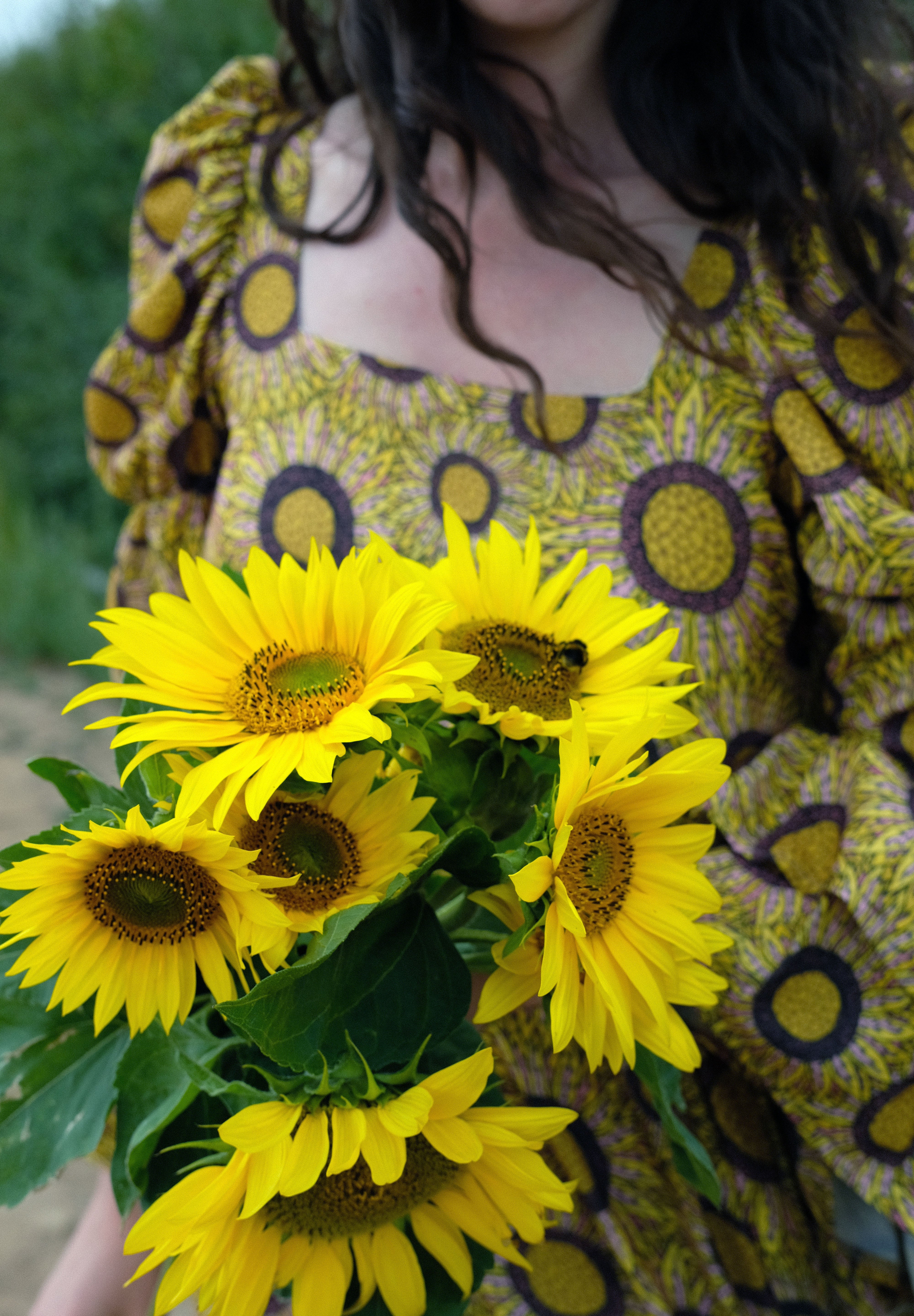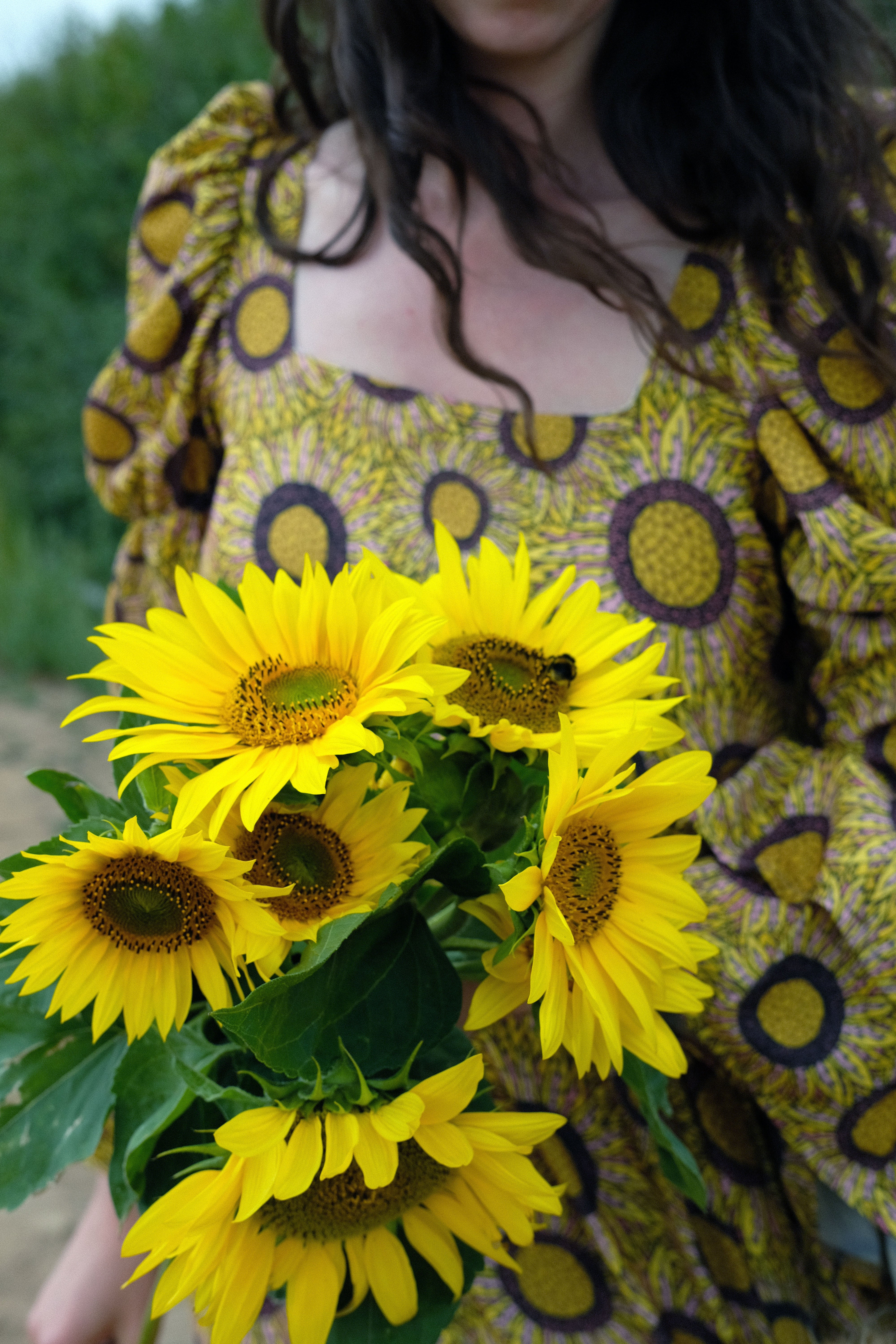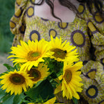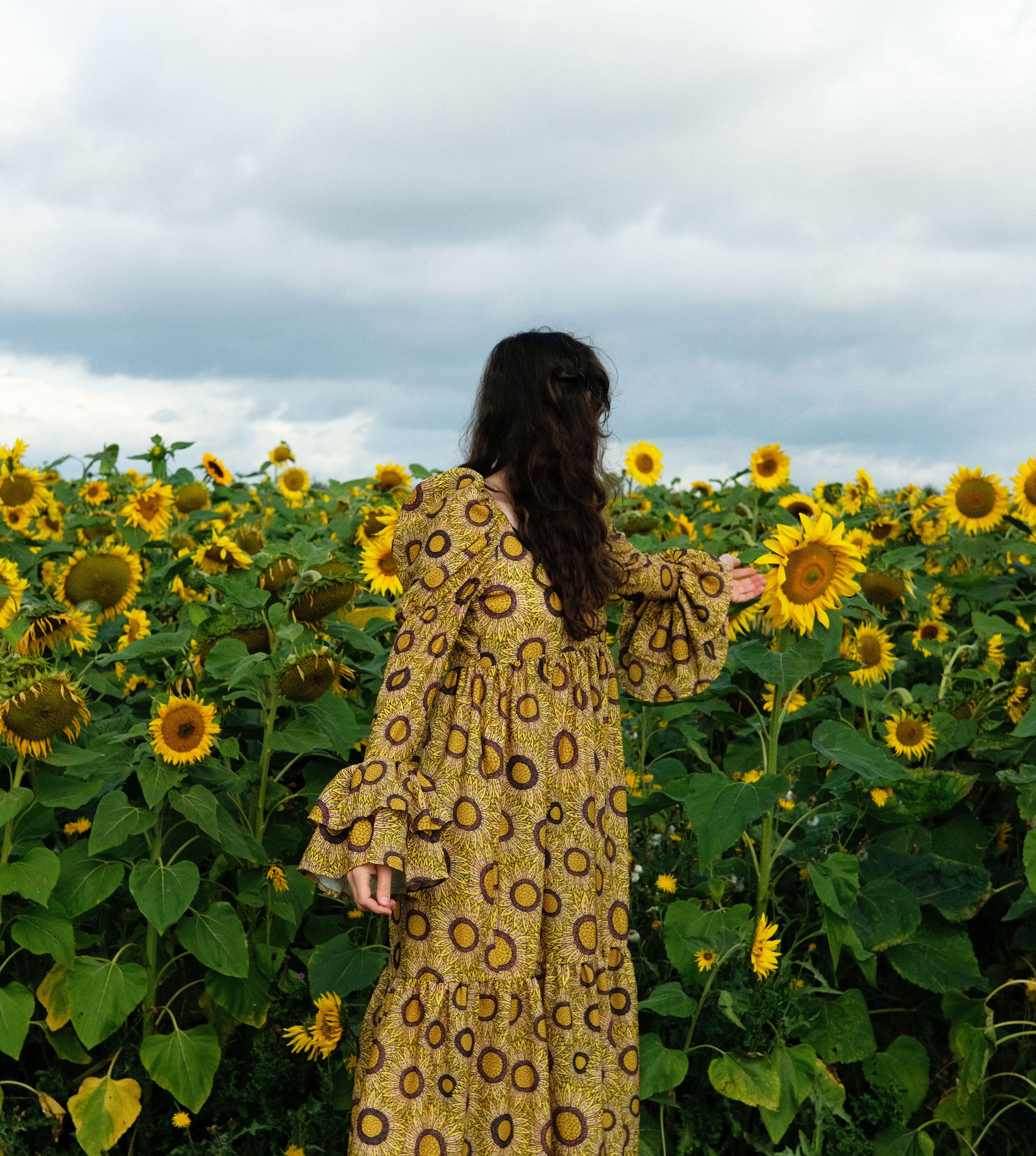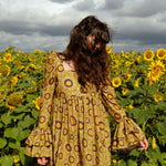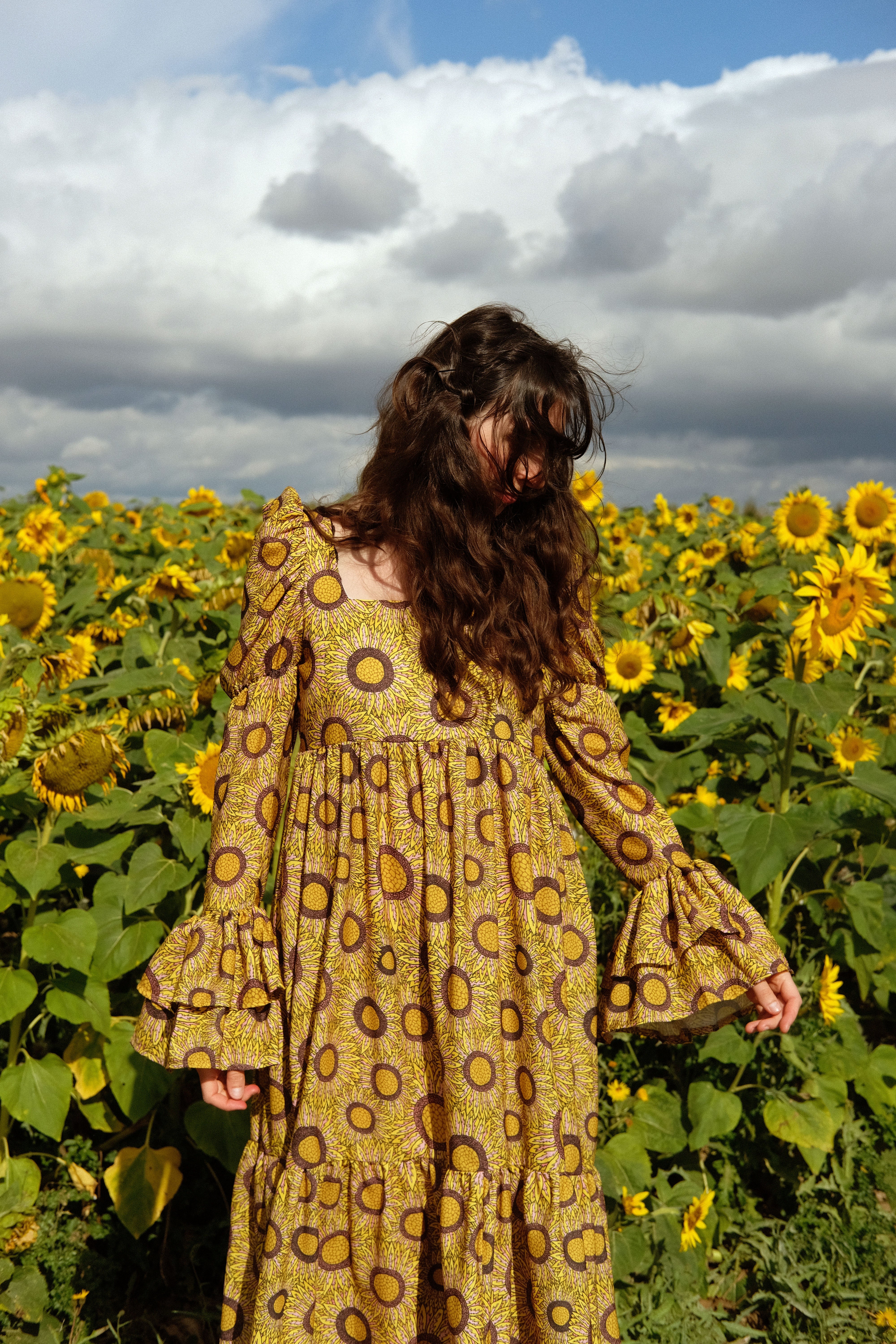 Zelda, a dress crafted with passion and artistry. This limited edition is made from flowing dead-stock linette, printed with our iconic Sunflower design. (We can make this dress from our crisper cotton when requested). Featuring our square neckline, and loose fitted bodice.