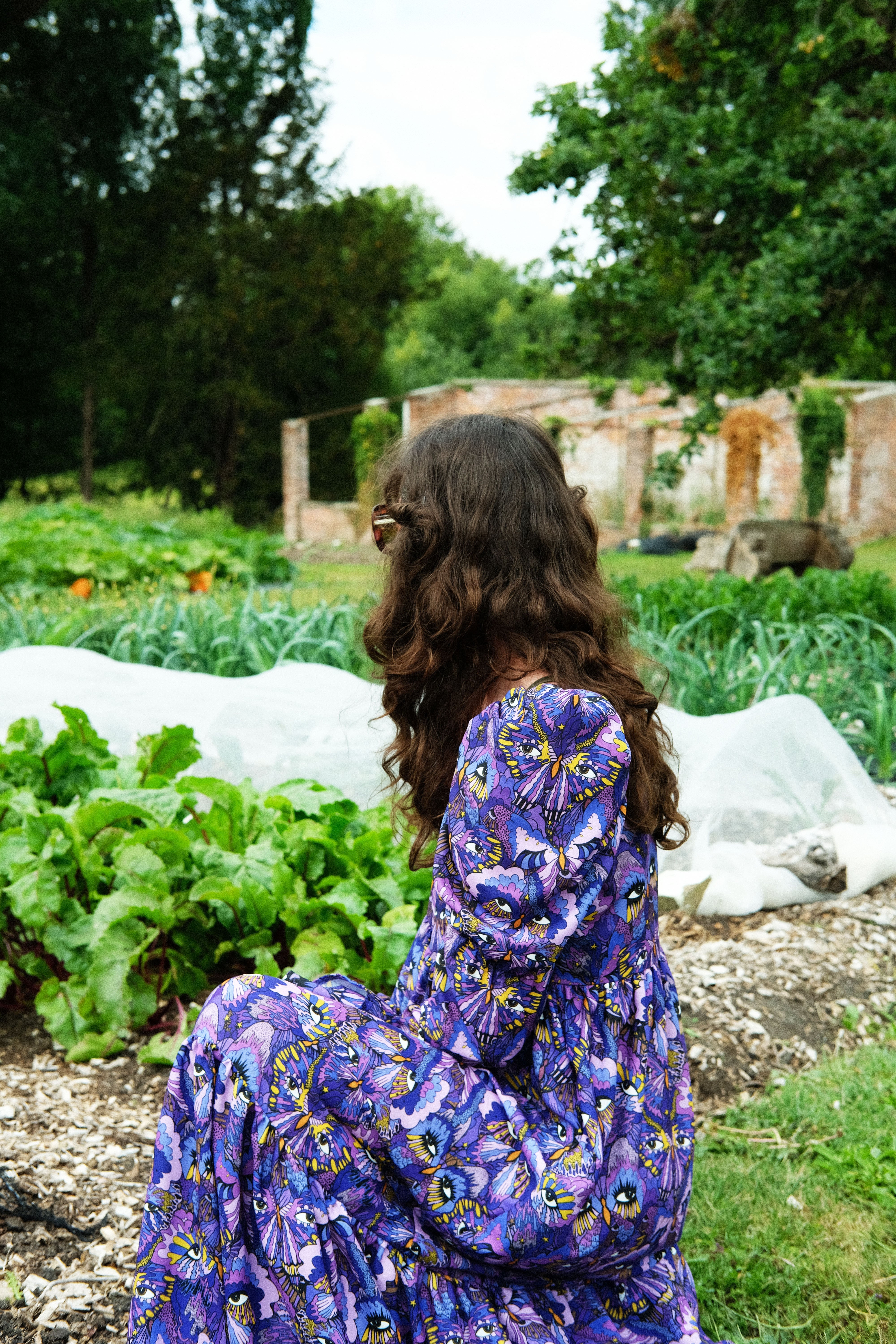 Zelda, a dress crafted with passion and artistry. This limited edition is made from flowing dead-stock linette, printed with our iconic Violet Butterfly design. (We can make this dress from our crisper cotton when requested). Featuring our square neckline, and loose fitted bodice.