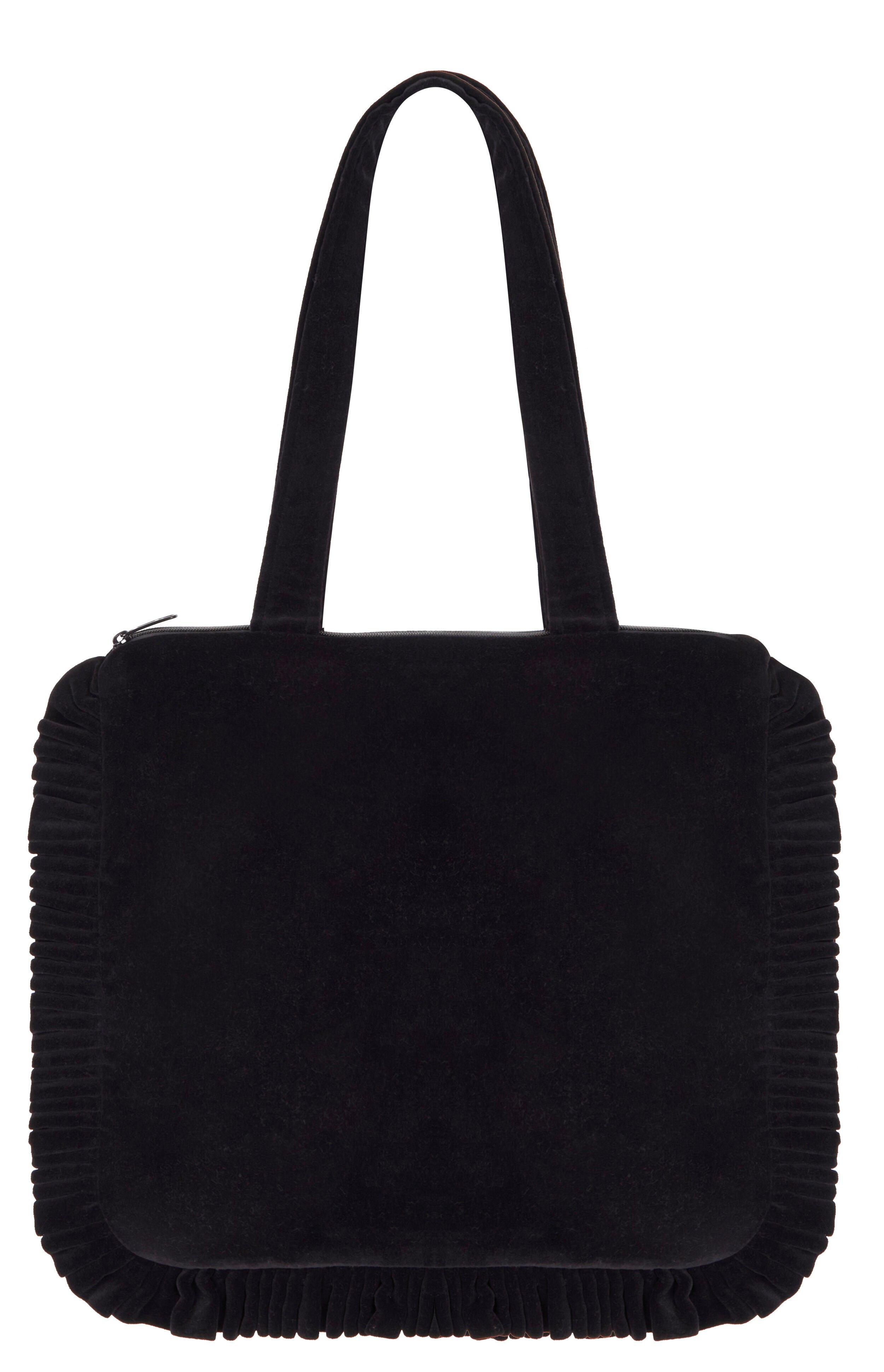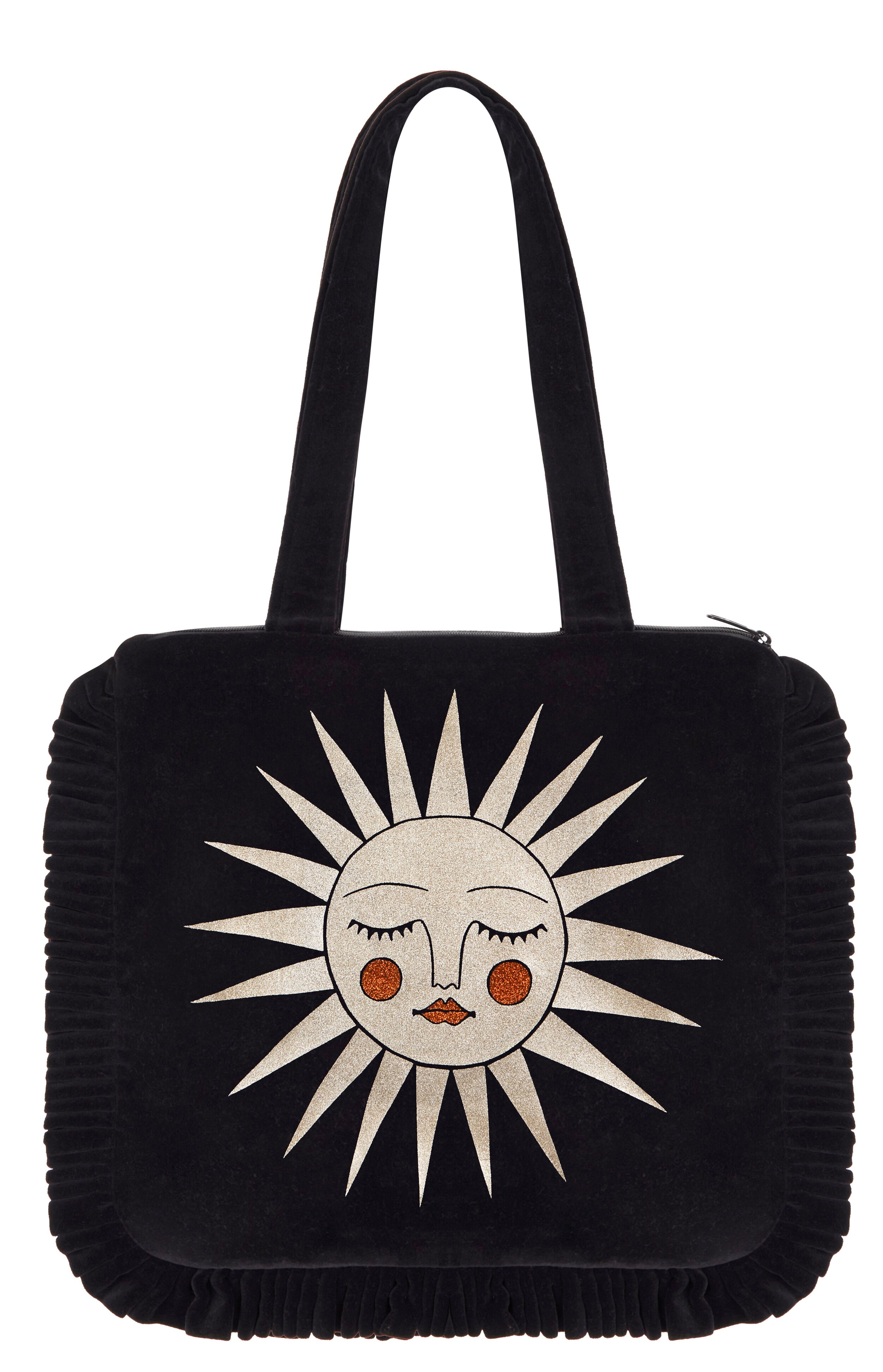 Adorned with delicate frills and a captivating shimmer, this bag beckons you to explore the hidden realms of your imagination. Adorned with Mary's iconic twinkling appliqués, luxurious velvet caresses your fingertips, while the fully lined interior and dual pockets offer both form and function.
