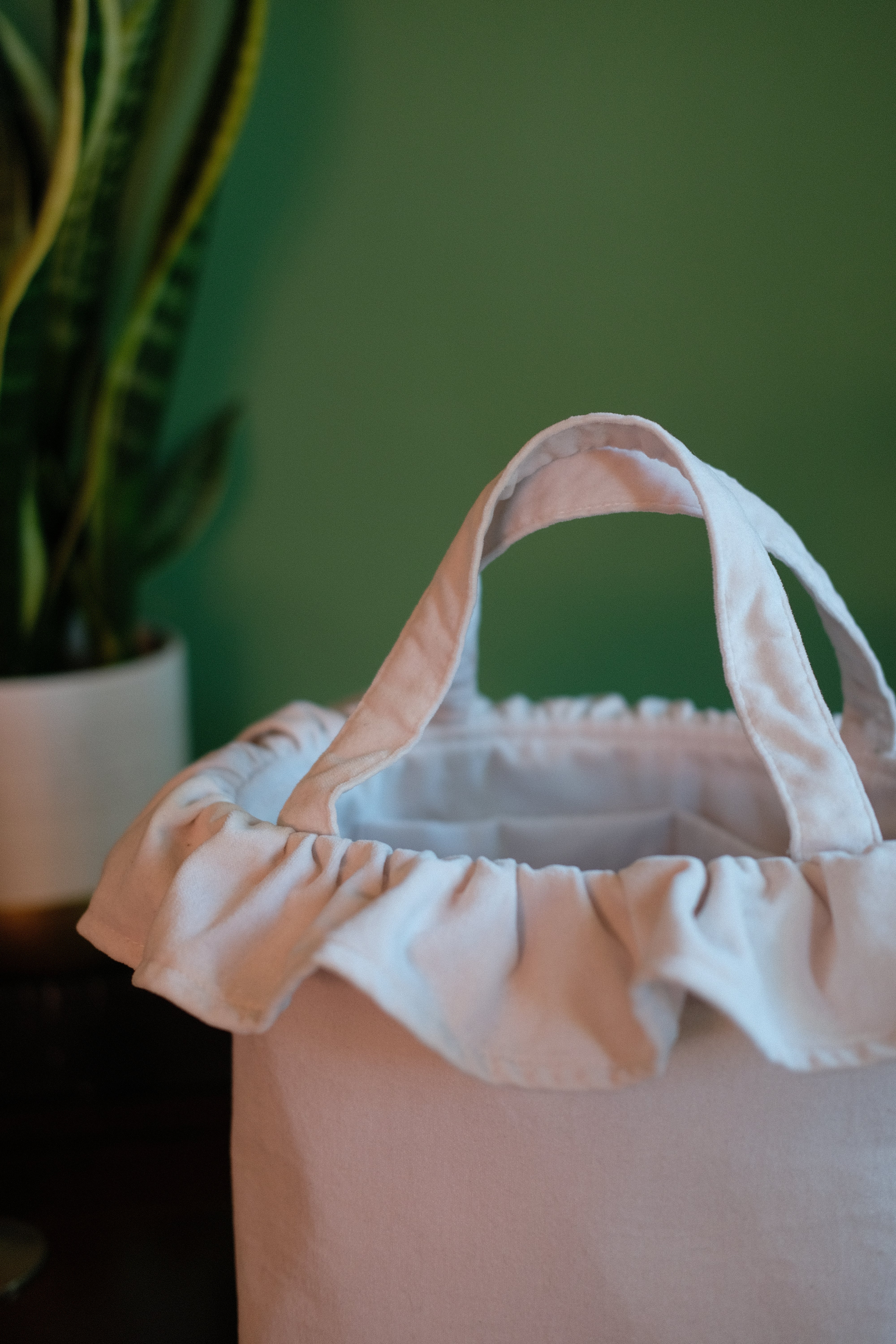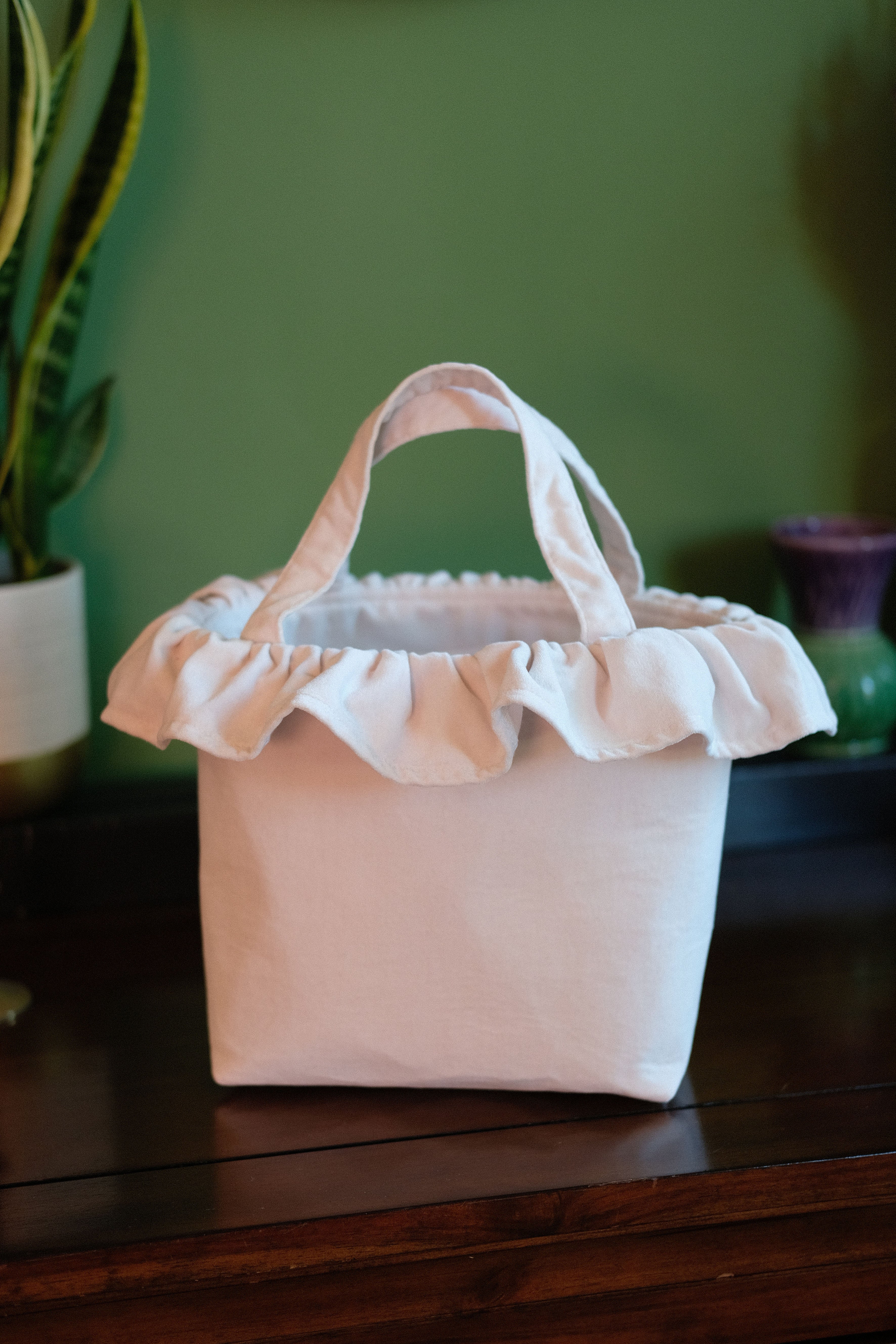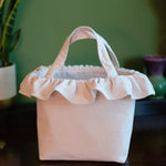Created from ivory cotton velvet and finished with a romantic frill. This versatile little handbag is perfect for carrying your wedding day essentials; fitting a large phone, purse, make up and even a little camera. Inside the fully lined interior is an extra pocket to keep the little things organised. The sturdy design measures 19cm in height with an opening of 24cm.