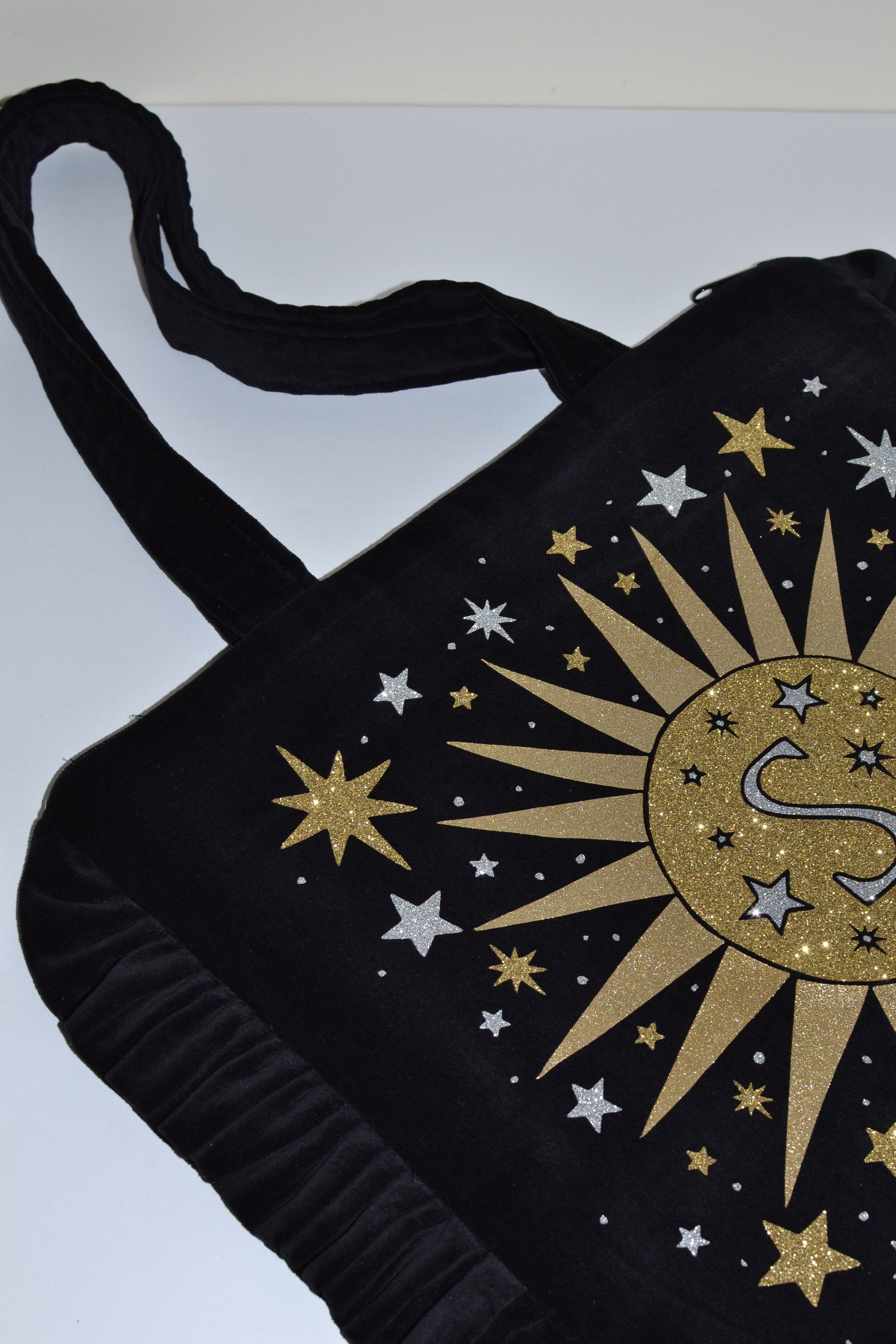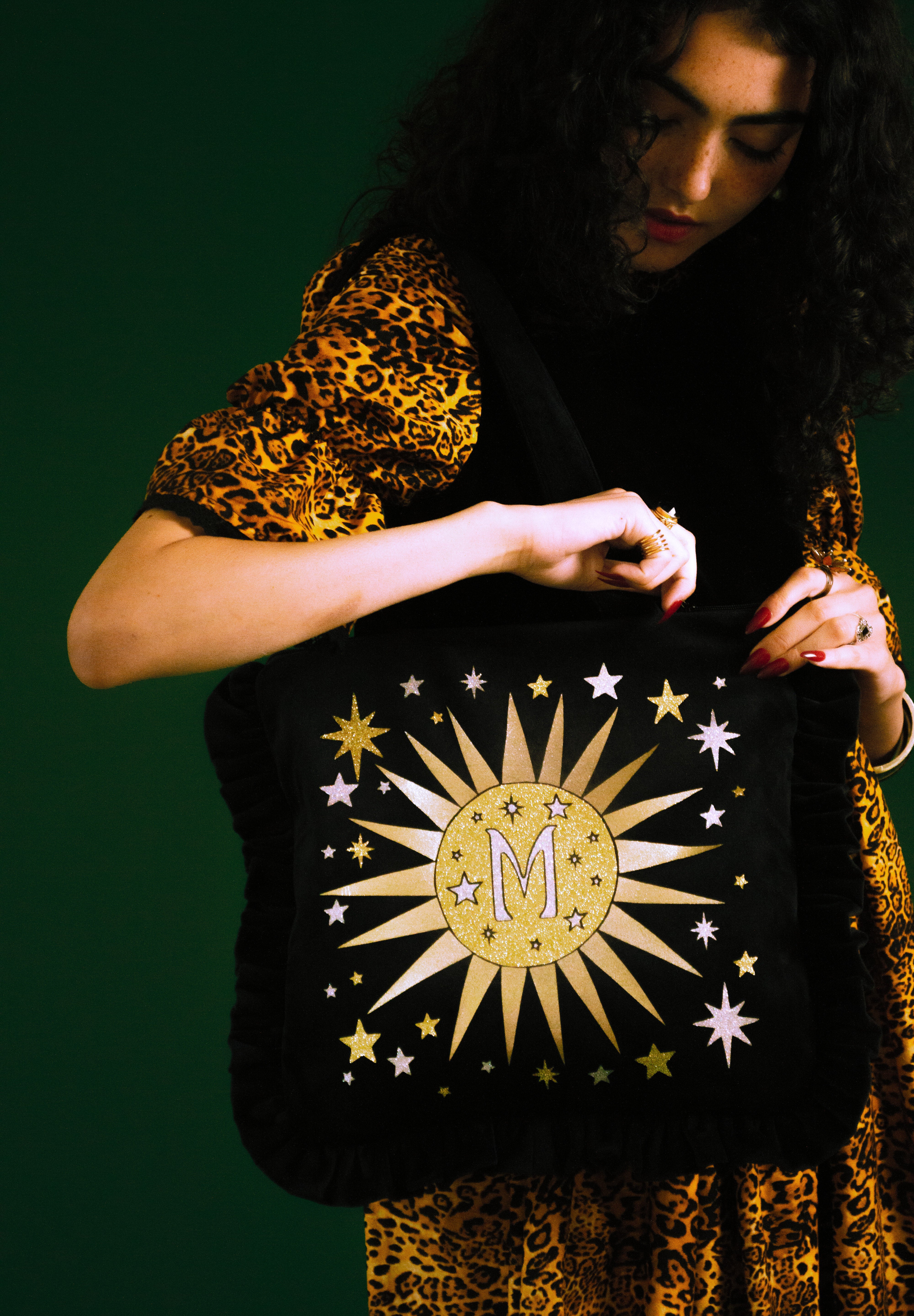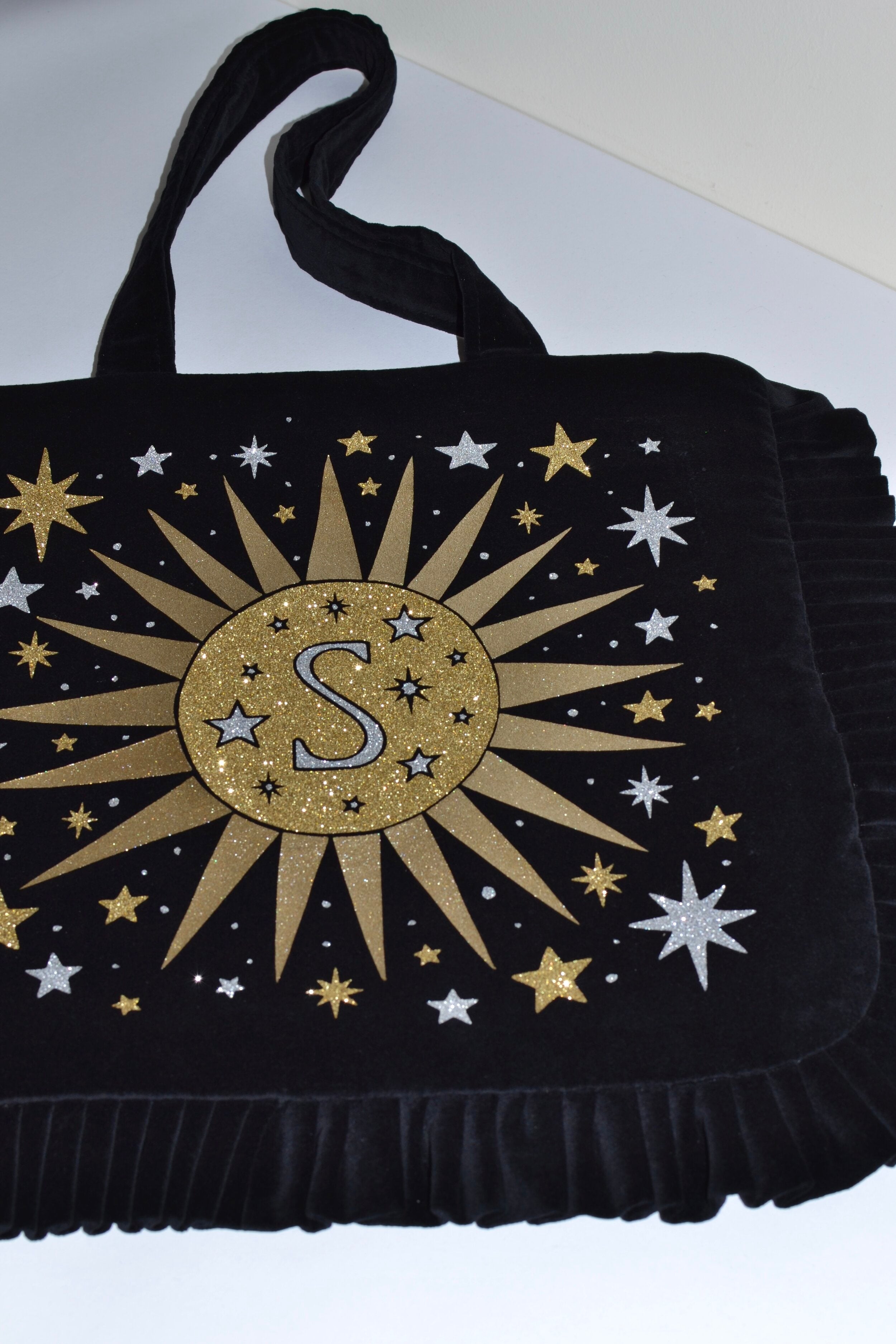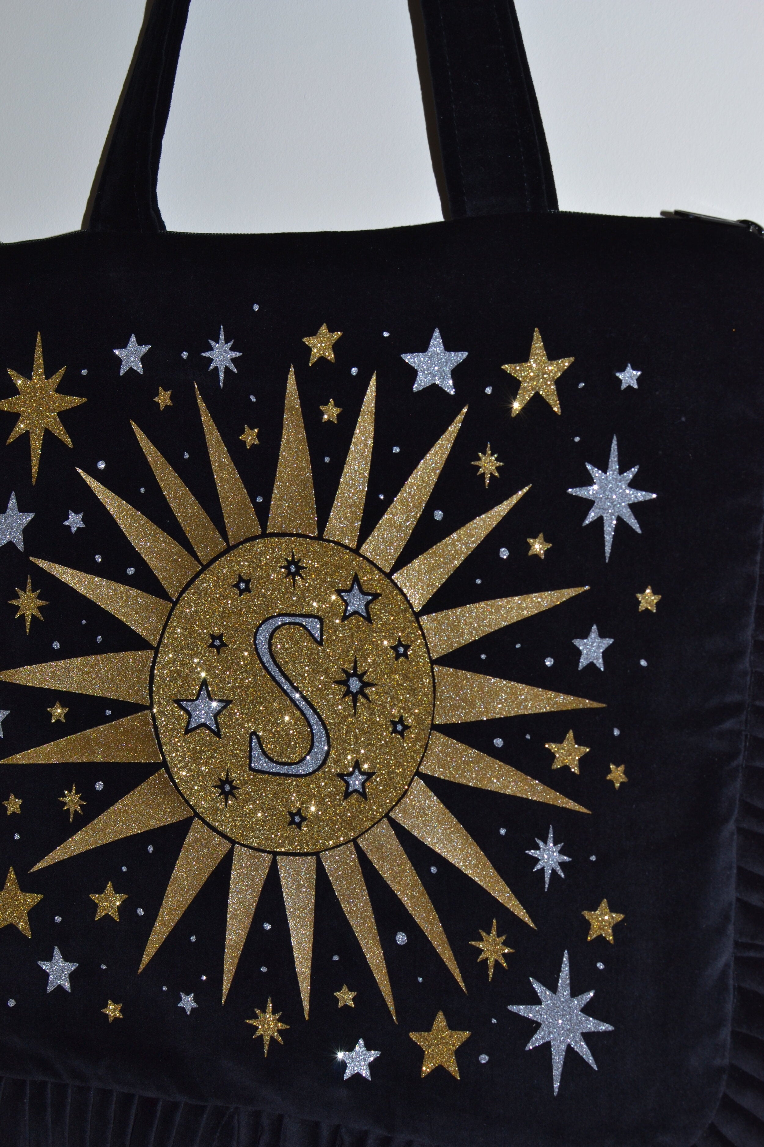 Unleash your celestial style and celebrate your name by choosing your very own letter, in our exclusive font surrounded by a magnificent celestial explosion. This enchanting accessory is crafted with a captivating blend of glamour and bohemian mystique. Swirling patterns evoke the mesmerising energy of a supernova, inviting you to embrace your inner cosmic goddess. Whether you're wandering through a moonlit garden or sipping elixirs at a chic soirée, this bag will make you the center of celestial attention. Unlock the secrets of the universe and let your style shine with the Supernova Monogram Velvet Bag.