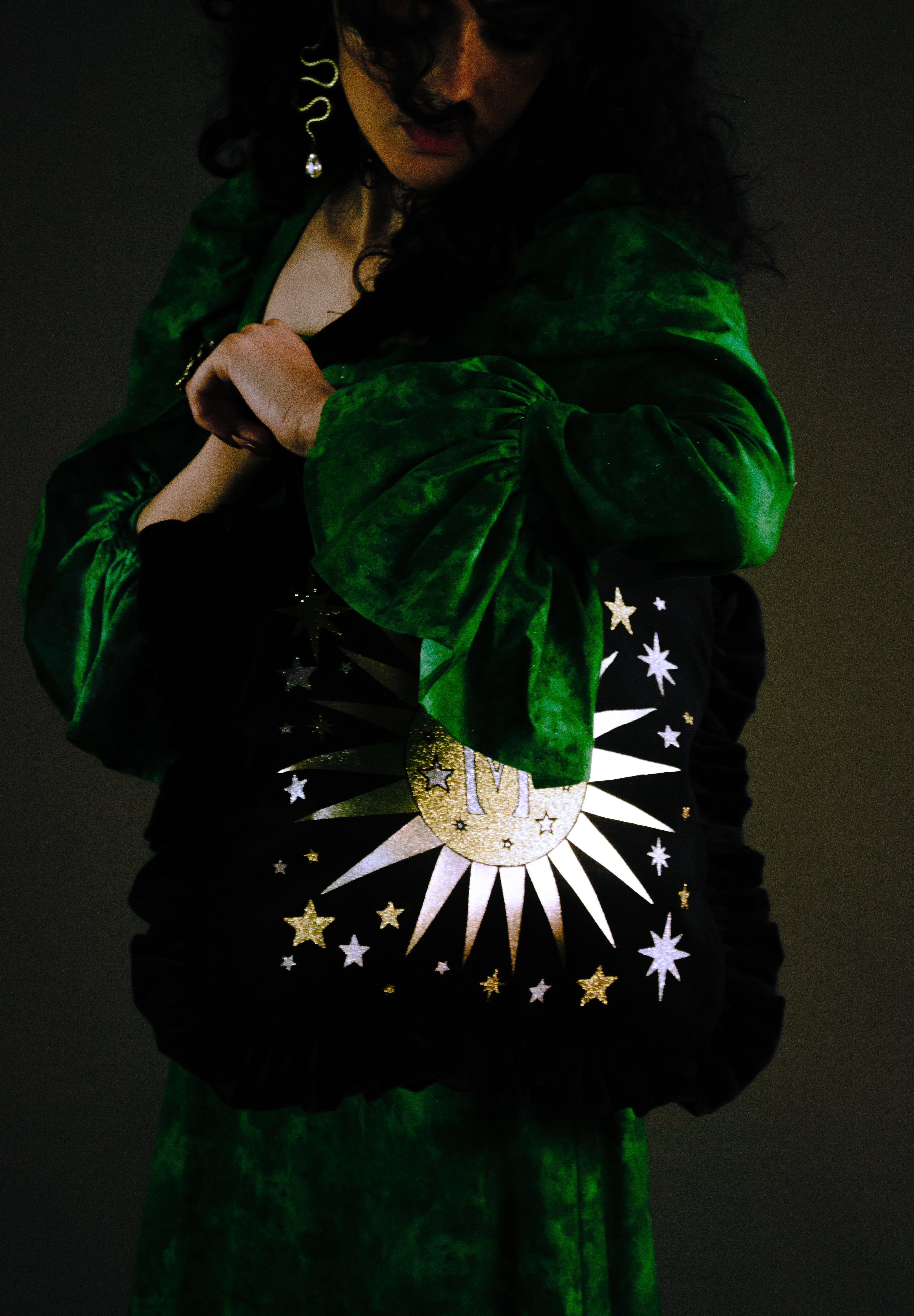 Adorned with Mary's iconic twinkling appliqués, luxurious velvet caresses your fingertips, while the fully lined interior and dual pockets offer both form and function.