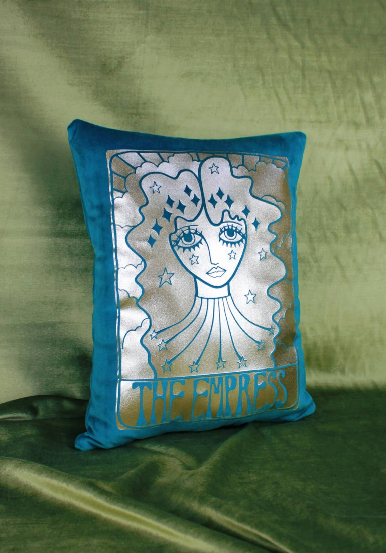 Transform your home or work space with our shimmering tarot collection velvet cushions. This isn’t just a cushion; it’s a statement of art and spirituality, hand-printed with Mary’s iconic shimmering appliqués. Infuse your space with a touch of bohemian charm, and elevate your decor to a realm where magic thrives. 12 x 16 inches.