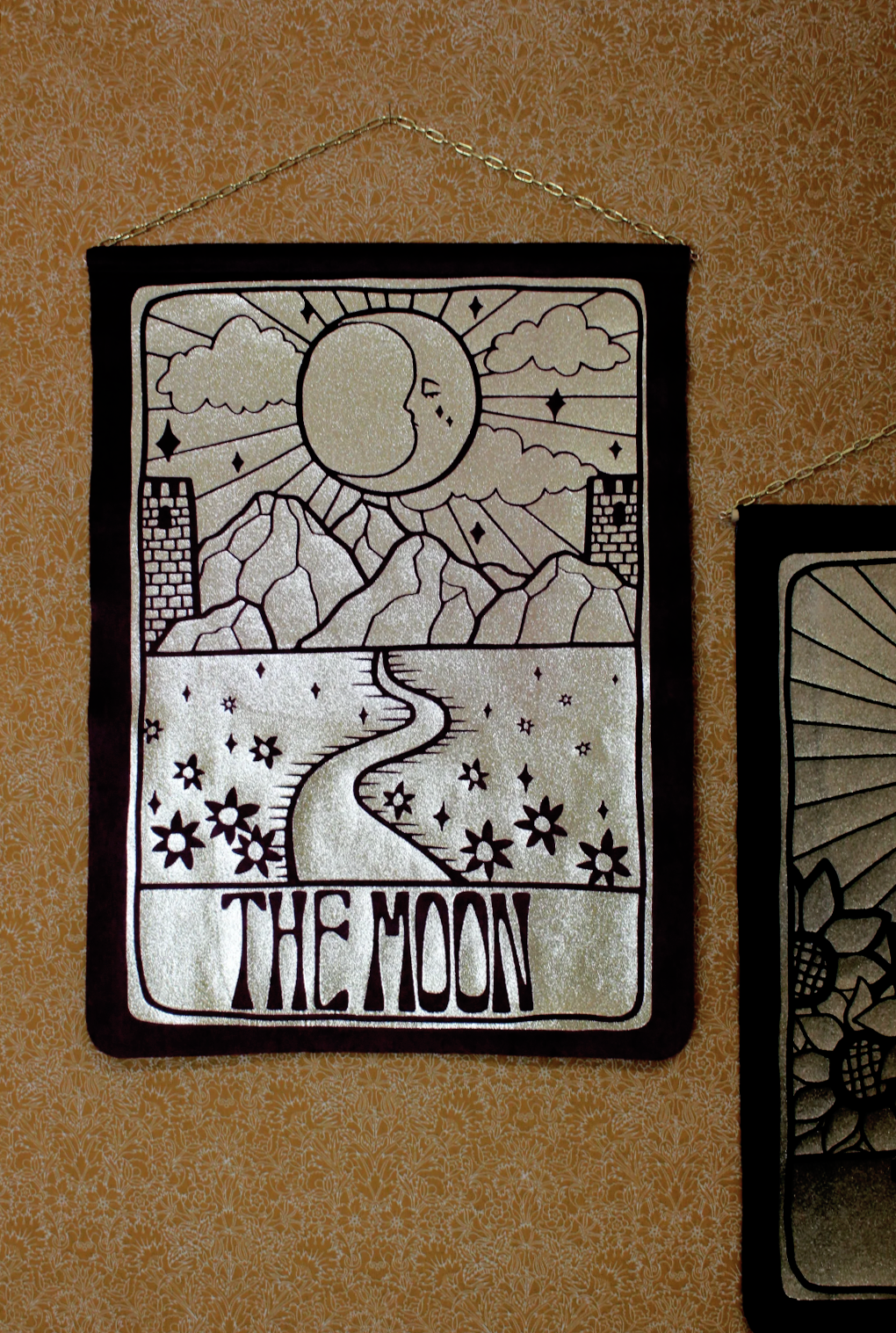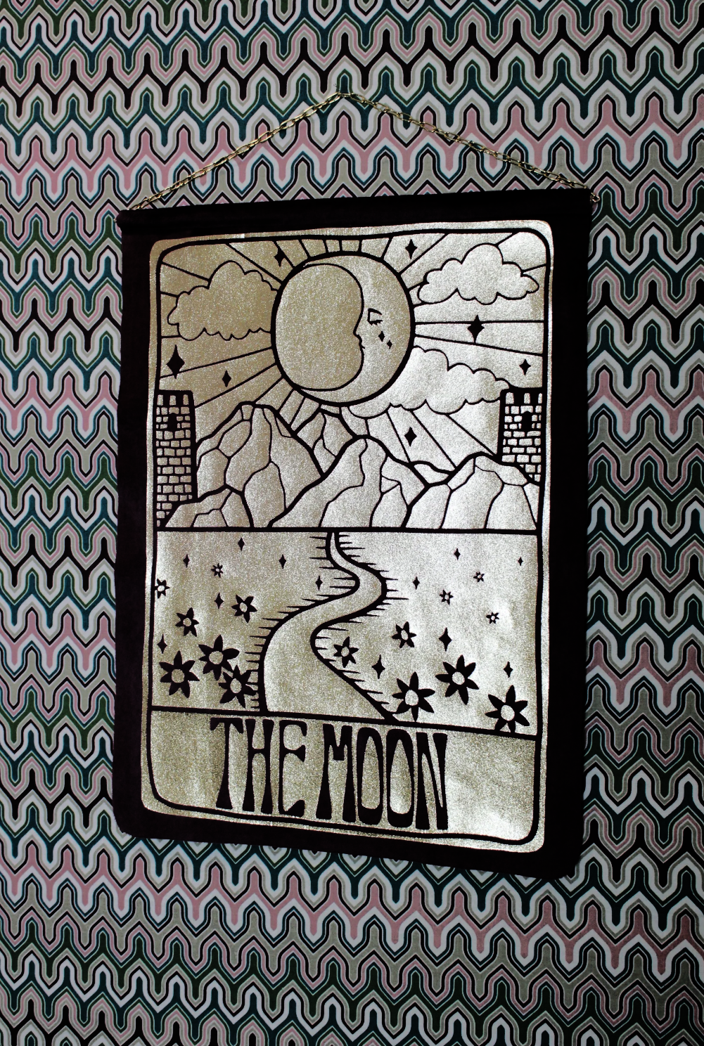Transform your space with our opulent shimmering gold vinyl printed wall hanging, hand printed on high quality dead-stock velvet. Raw trimmed edge for a beautiful flush lay against the wall. Bamboo rod inside attached to a gold coloured metal chain suitable to hang from a nail, hook or other. Finished with a gold shimmering Mary Benson logo on the back. Dimensions approximately 30 x 41 cm. Chain length approximately 33cm.