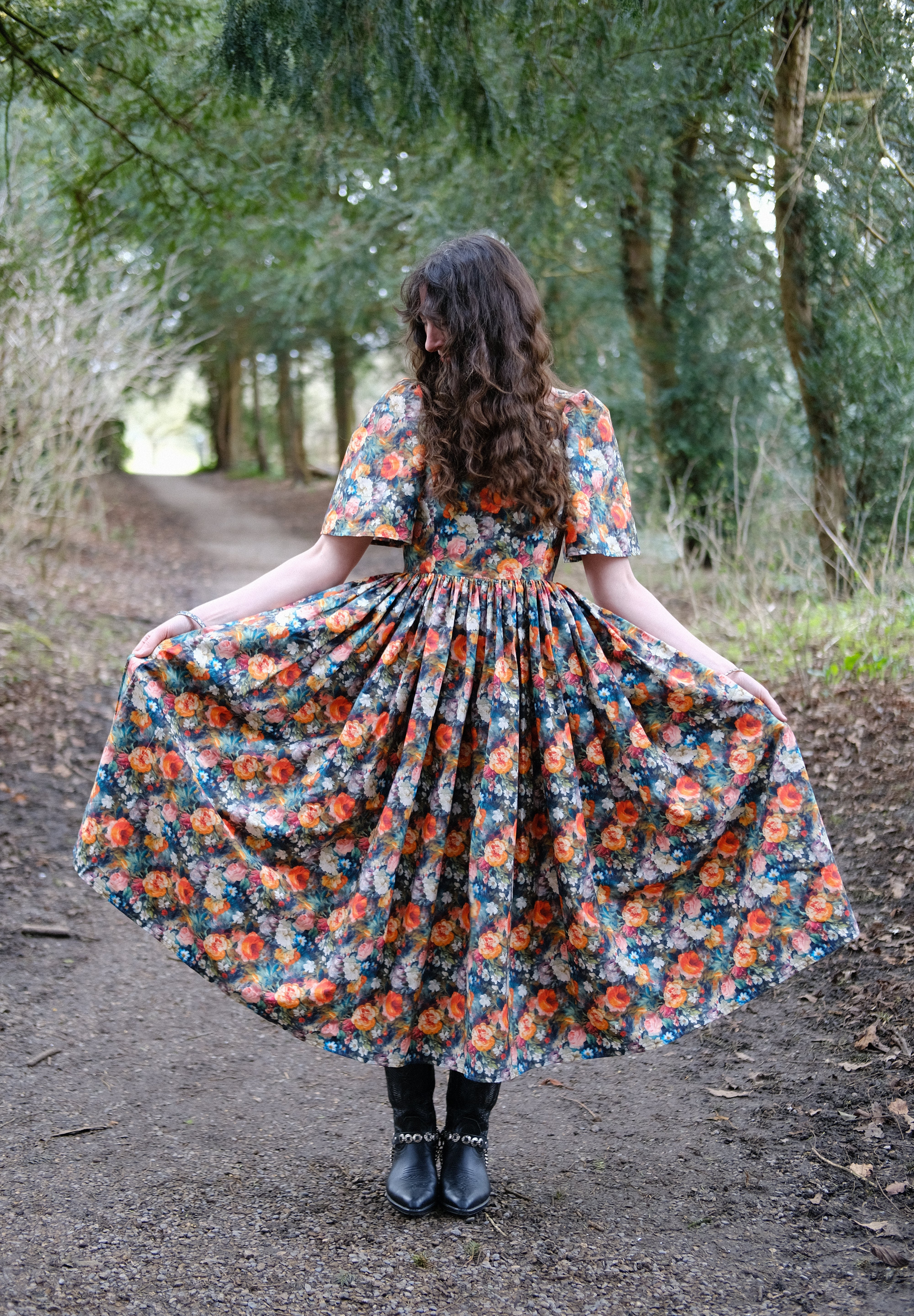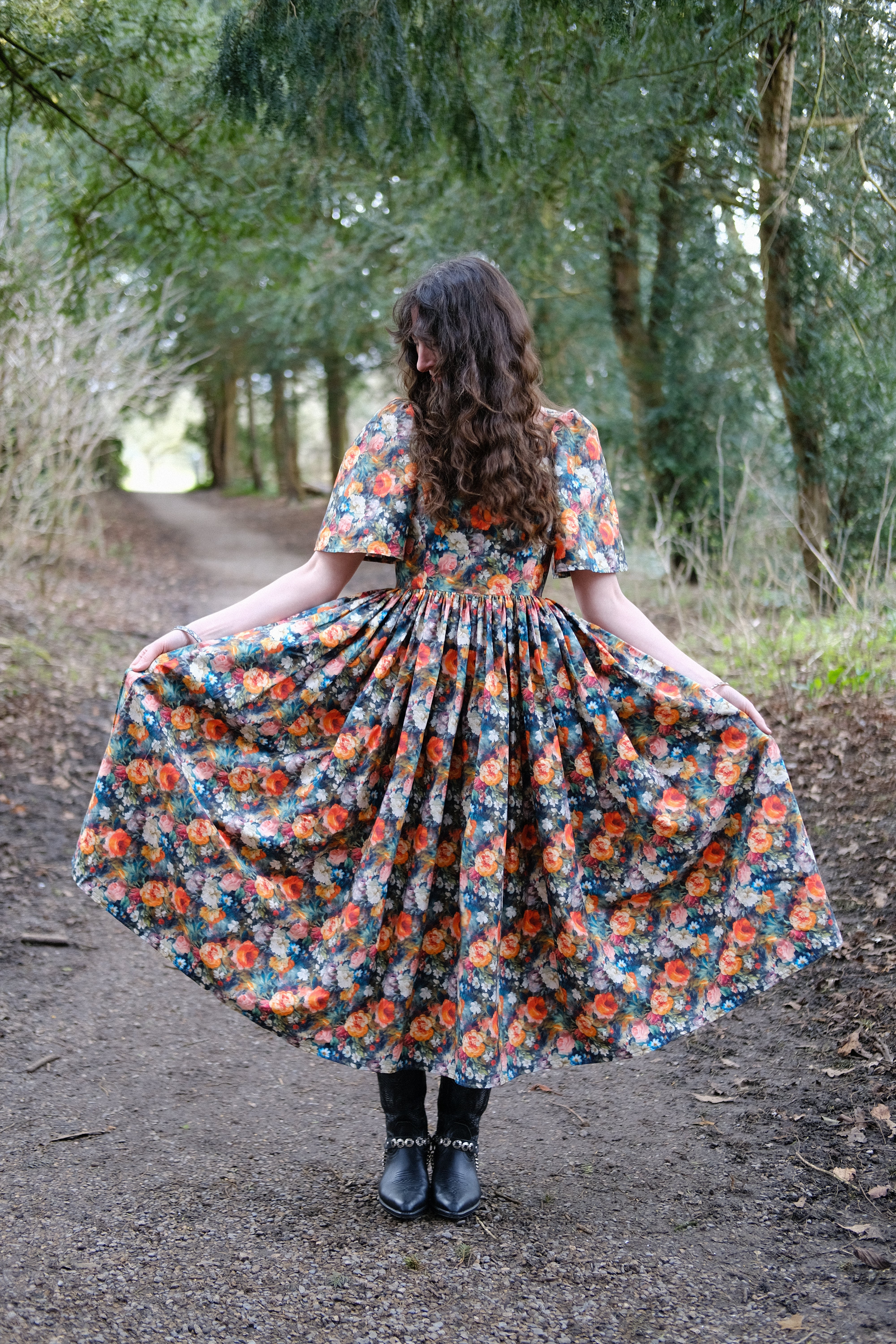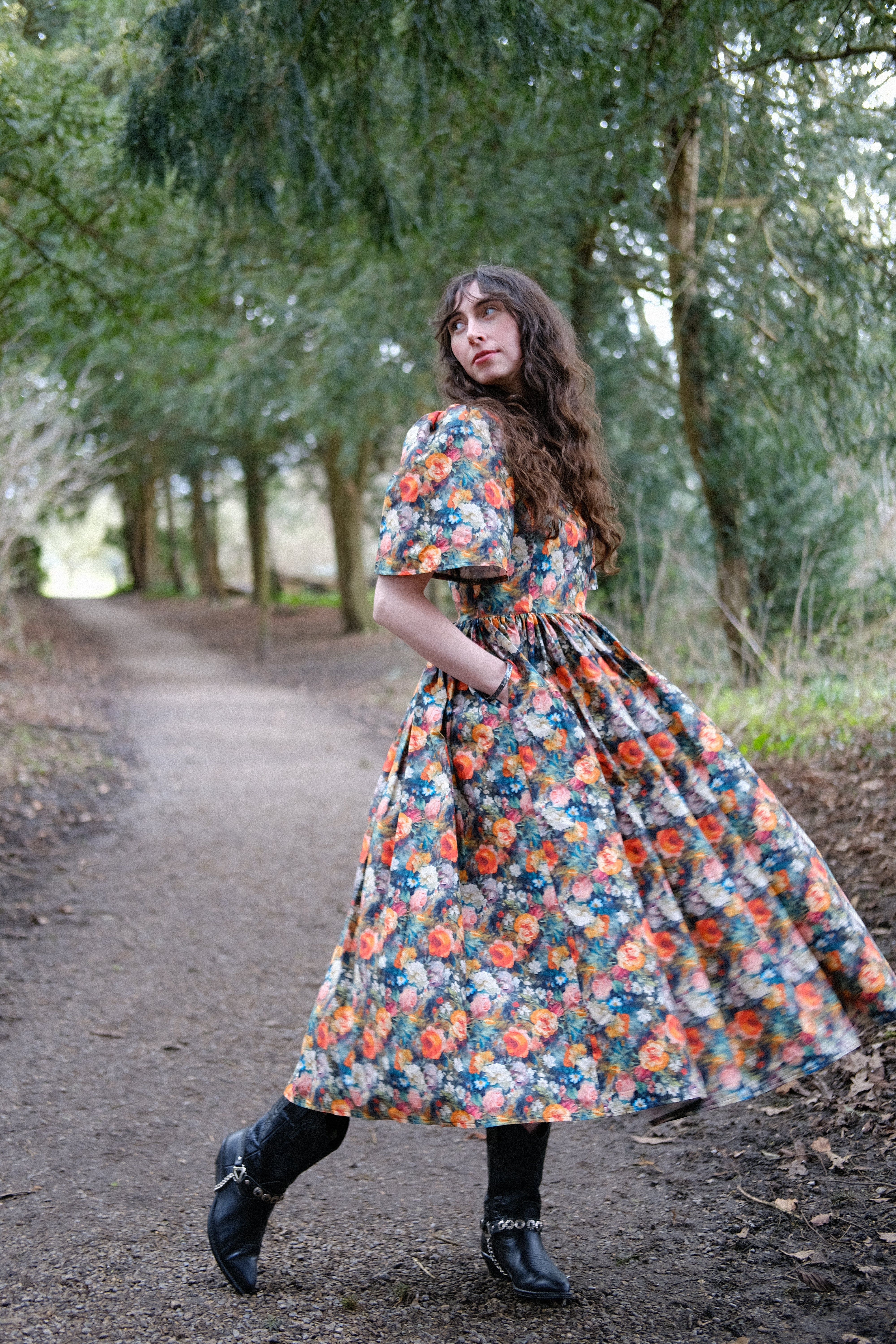 I was feeling in a slump after the cold and dark winter months, having decided to not persue my dressmaking career as fully as I once did, and having not designed any dresses for a while, I needed some inspiration. My inspiration often comes from fabric and I when saw this incredible floral rose garden cotton and could instantly envisage the Morwenna dress. I designed this new style during Imbolc, when the snowdrops started peeping through the earth. I was feeling so deeply drawn to Spring and brighter days, dreaming of days out, holidays and coming out of the long wintering period. I wanted a dress full of volume and I wanted a new sleeve which wasn't like my others, something new. The Morwenna dress is so versitile, it's more than just a pretty dress. It has deep side seam pockets, it's great for layering (i'm wearing thermals under mine in the photo's as the photo's were taken in February). It's perfect to dress up for a wedding, dress down and made casual enough for a Sunday lunch, pretty for a picnic with friends, a date or a weekend walk with boots. The skirt length 90cm so you can see your shoes or boots, a perfect 'ballerina length'. I am neruodiverse and I can't wear certain types of clothing or synthetic fabrics, I'm always conscious of this when I'm designing so the fit is just right and doesn't irritate me in ways many other dresses do. The cotton is breathable and light, and it's easy to wash. The Morwenna style features my iconic square neckline, a concealed centre back zip and gathered sleeves.