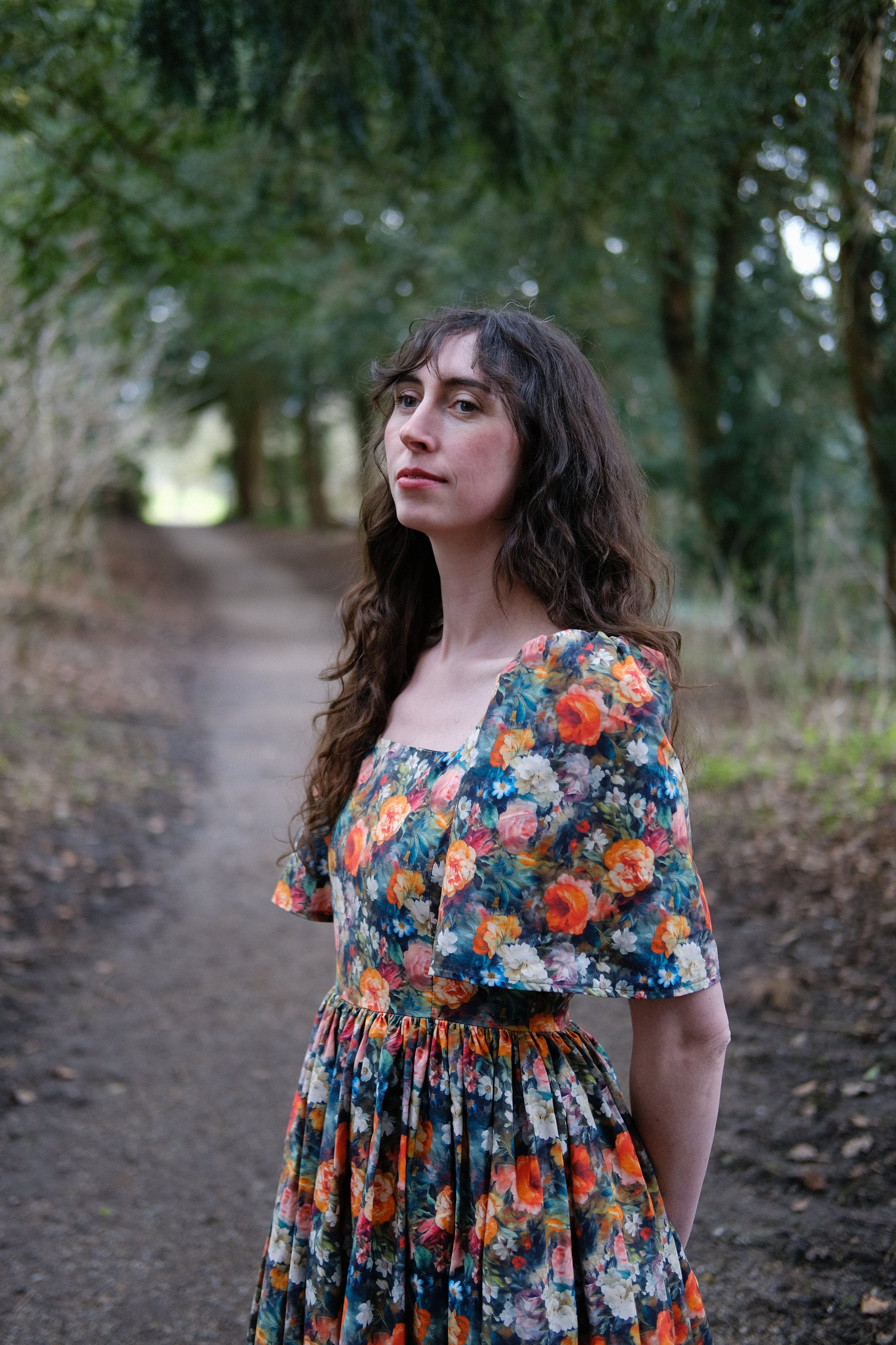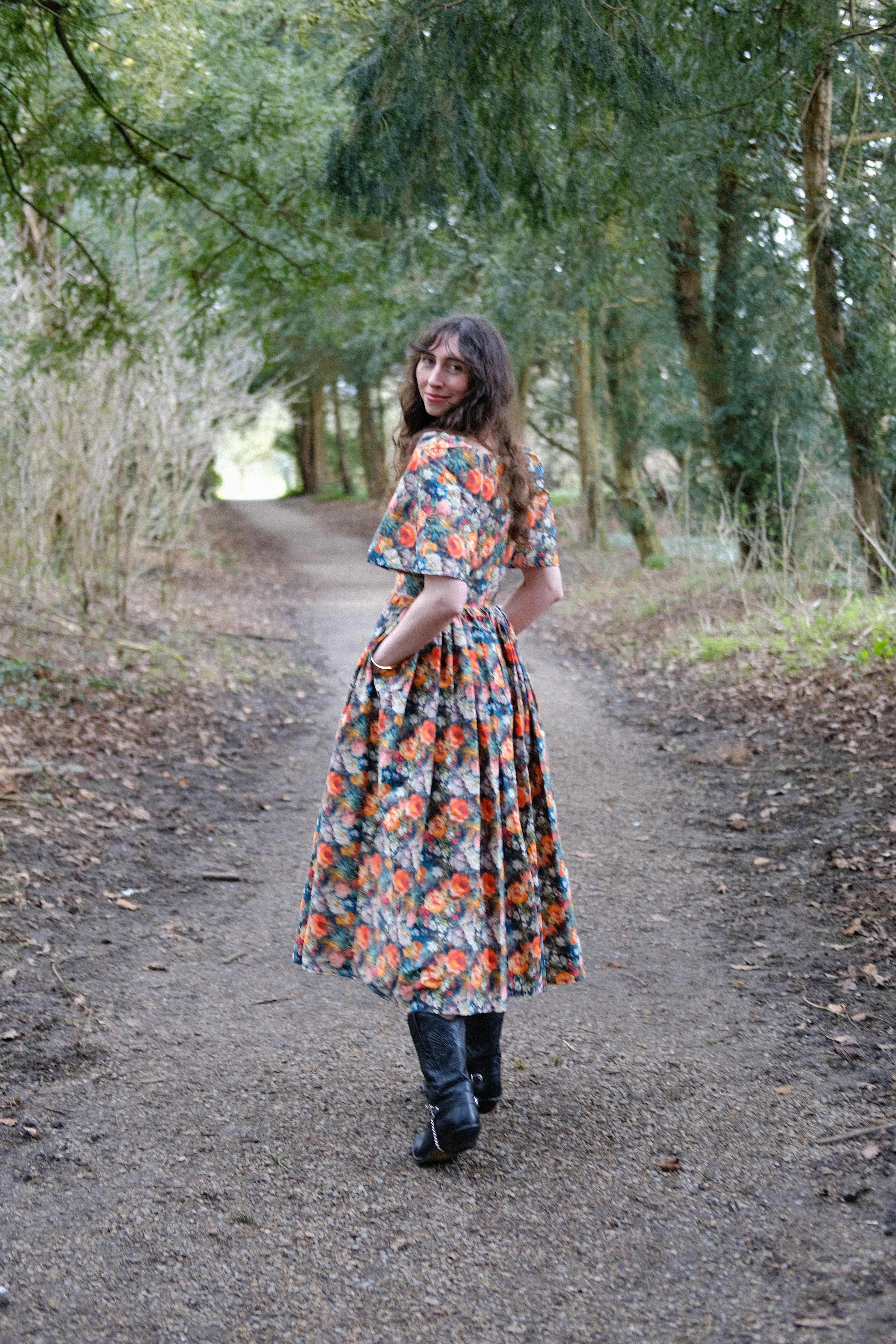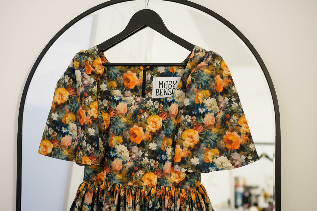 I was feeling in a slump after the cold and dark winter months, having decided to not persue my dressmaking career as fully as I once did, and having not designed any dresses for a while, I needed some inspiration. My inspiration often comes from fabric and I when saw this incredible floral rose garden cotton and could instantly envisage the Morwenna dress. I designed this new style during Imbolc, when the snowdrops started peeping through the earth. I was feeling so deeply drawn to Spring and brighter days, dreaming of days out, holidays and coming out of the long wintering period. I wanted a dress full of volume and I wanted a new sleeve which wasn't like my others, something new. The Morwenna dress is so versitile, it's more than just a pretty dress. It has deep side seam pockets, it's great for layering (i'm wearing thermals under mine in the photo's as the photo's were taken in February). It's perfect to dress up for a wedding, dress down and made casual enough for a Sunday lunch, pretty for a picnic with friends, a date or a weekend walk with boots. The skirt length 90cm so you can see your shoes or boots, a perfect 'ballerina length'. I am neruodiverse and I can't wear certain types of clothing or synthetic fabrics, I'm always conscious of this when I'm designing so the fit is just right and doesn't irritate me in ways many other dresses do. The cotton is breathable and light, and it's easy to wash. The Morwenna style features my iconic square neckline, a concealed centre back zip and gathered sleeves.