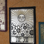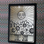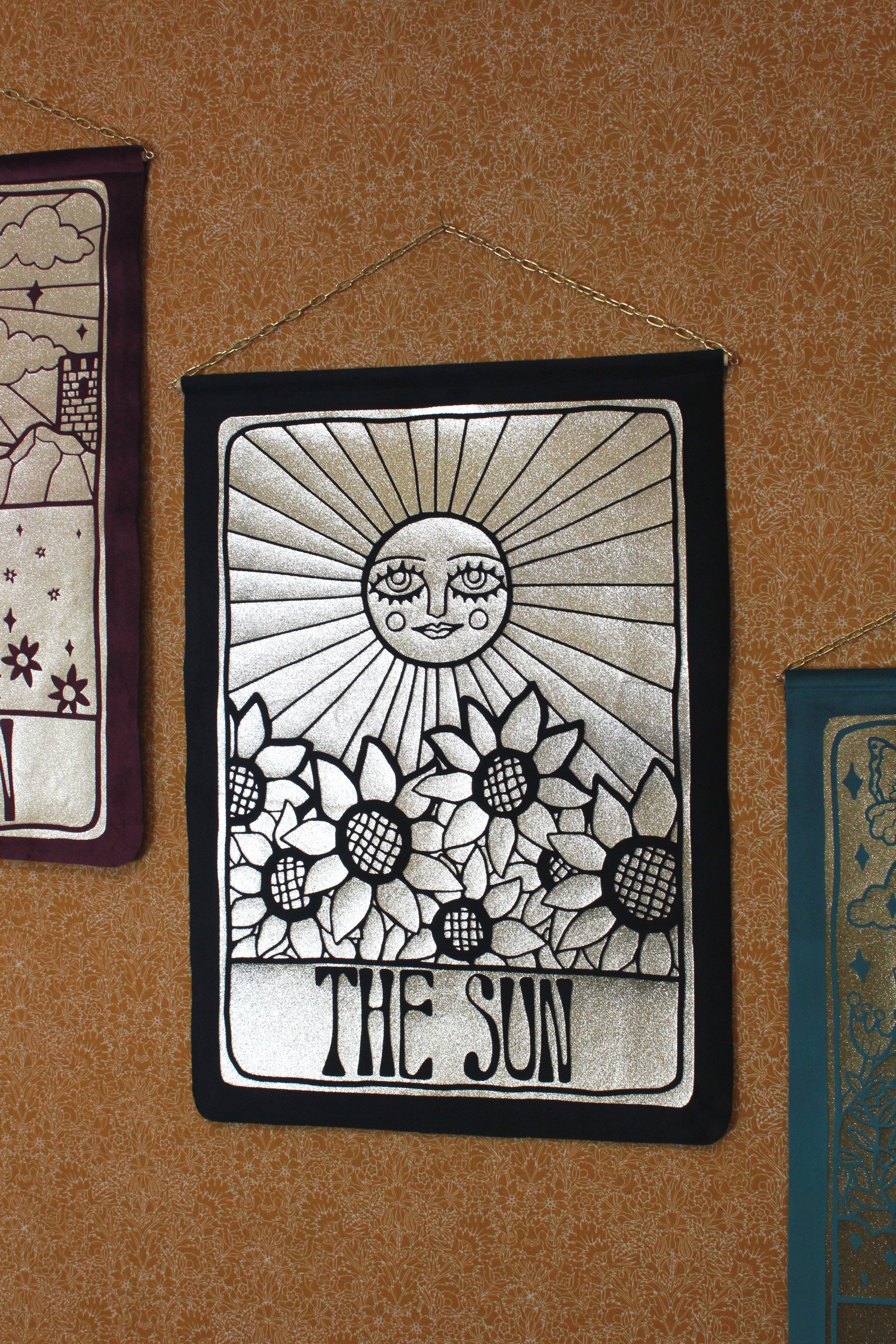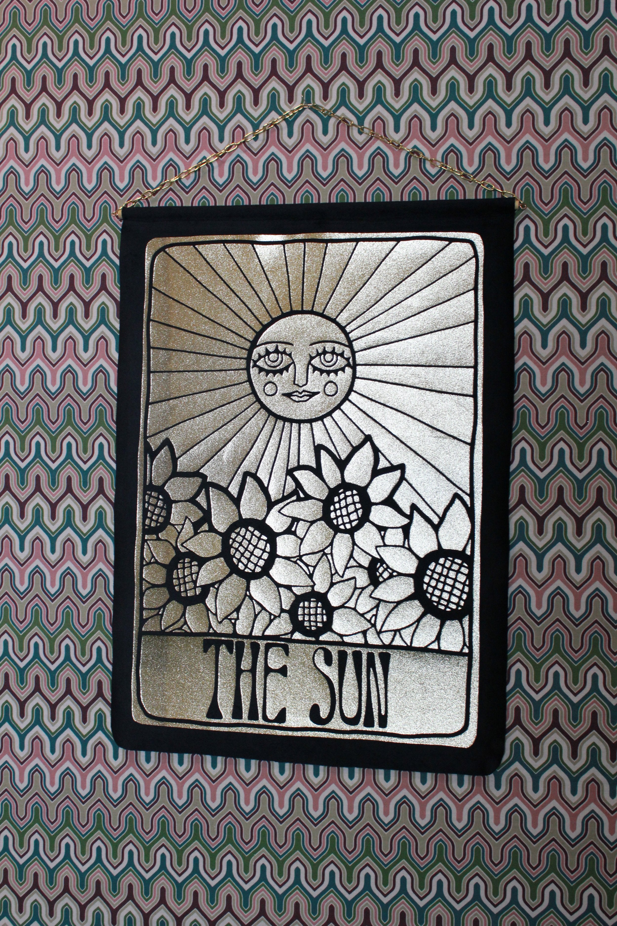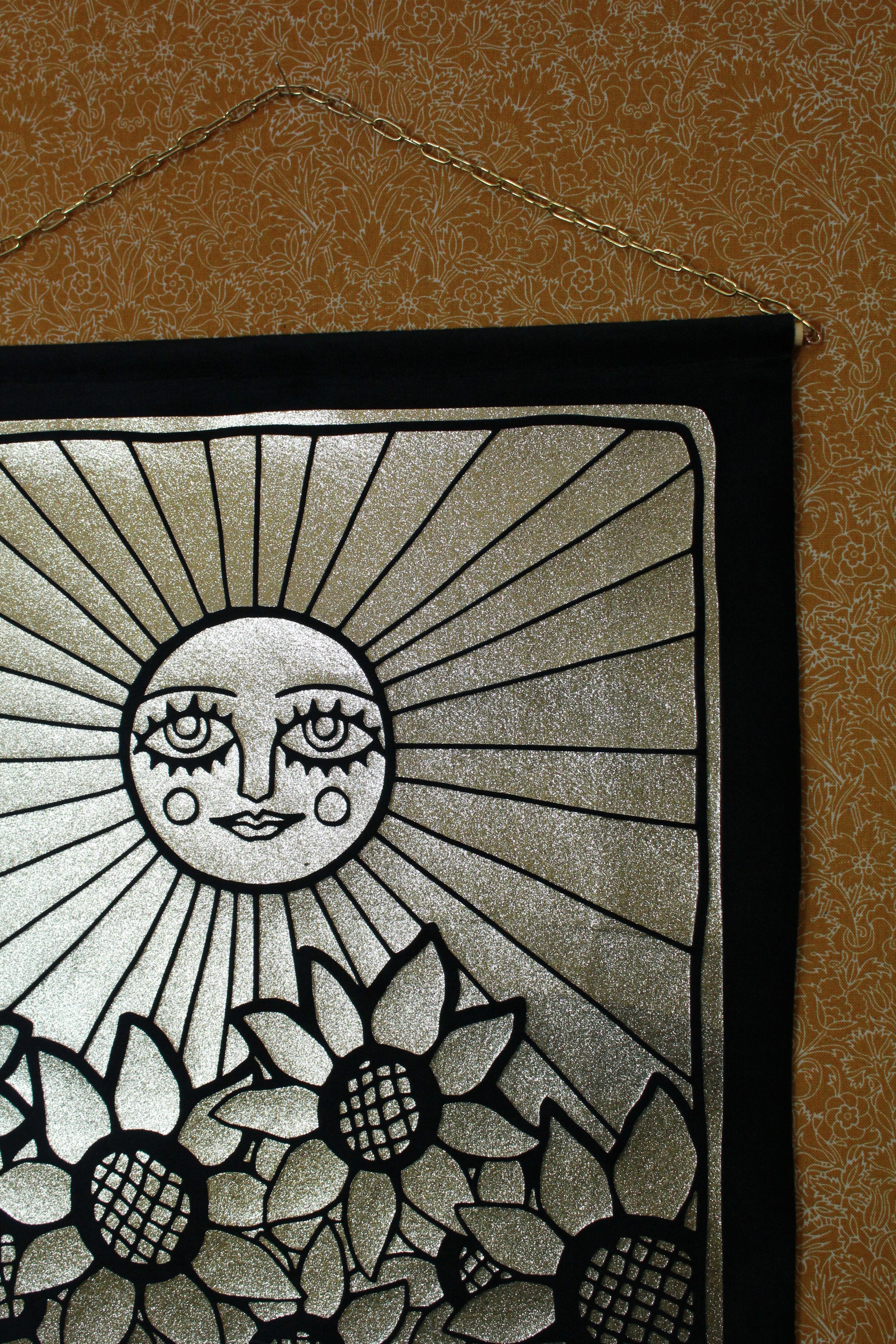 Transform your space with our opulent shimmering gold vinyl printed wall hanging, hand printed on high quality dead-stock velvet. Raw trimmed edge for a beautiful flush lay against the wall. Bamboo rod inside attached to a gold coloured metal chain suitable to hang from a nail, hook or other. Finished with a gold shimmering Mary Benson logo on the back. Dimensions approximately 30 x 41 cm. Chain length approximately 33cm.