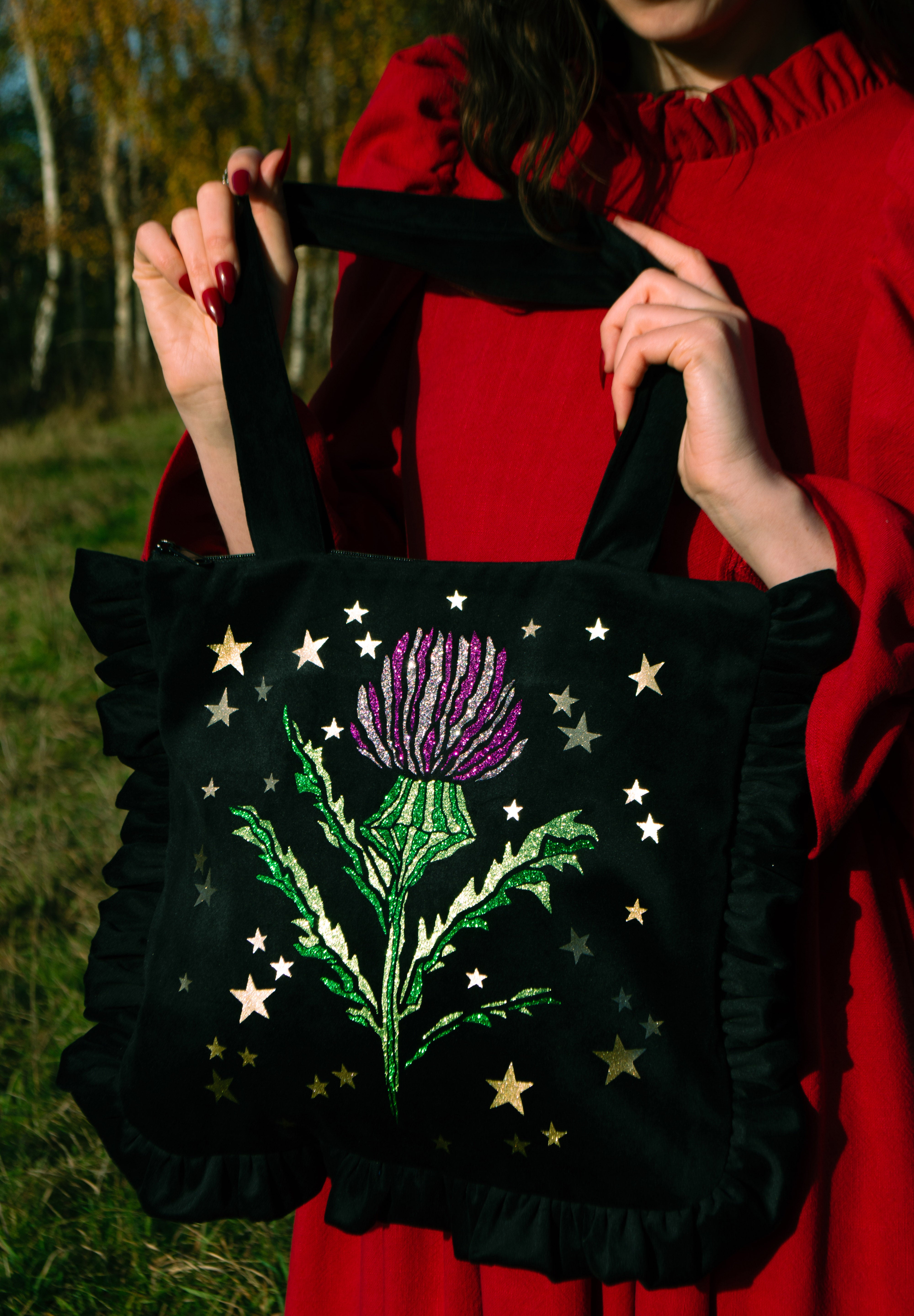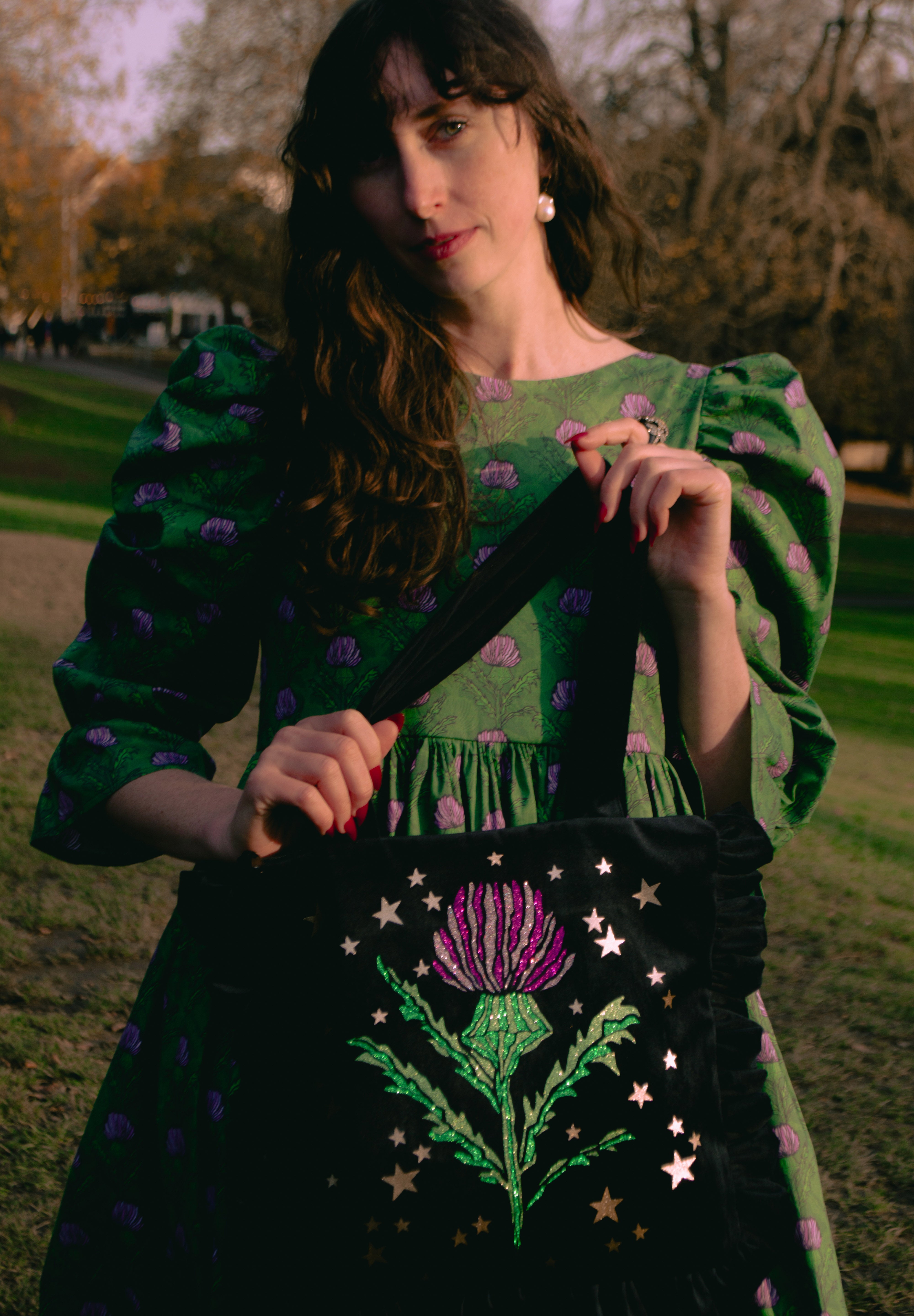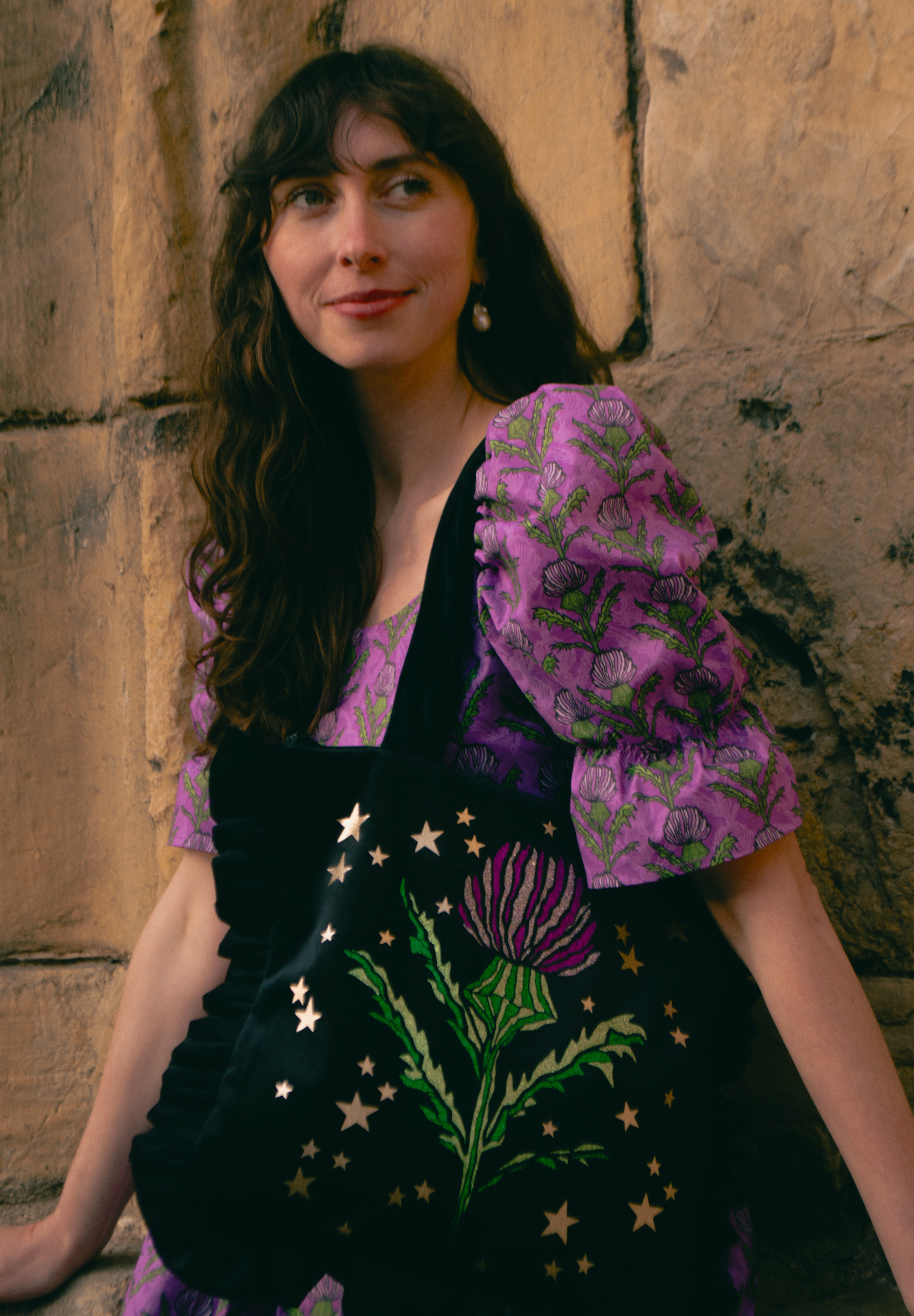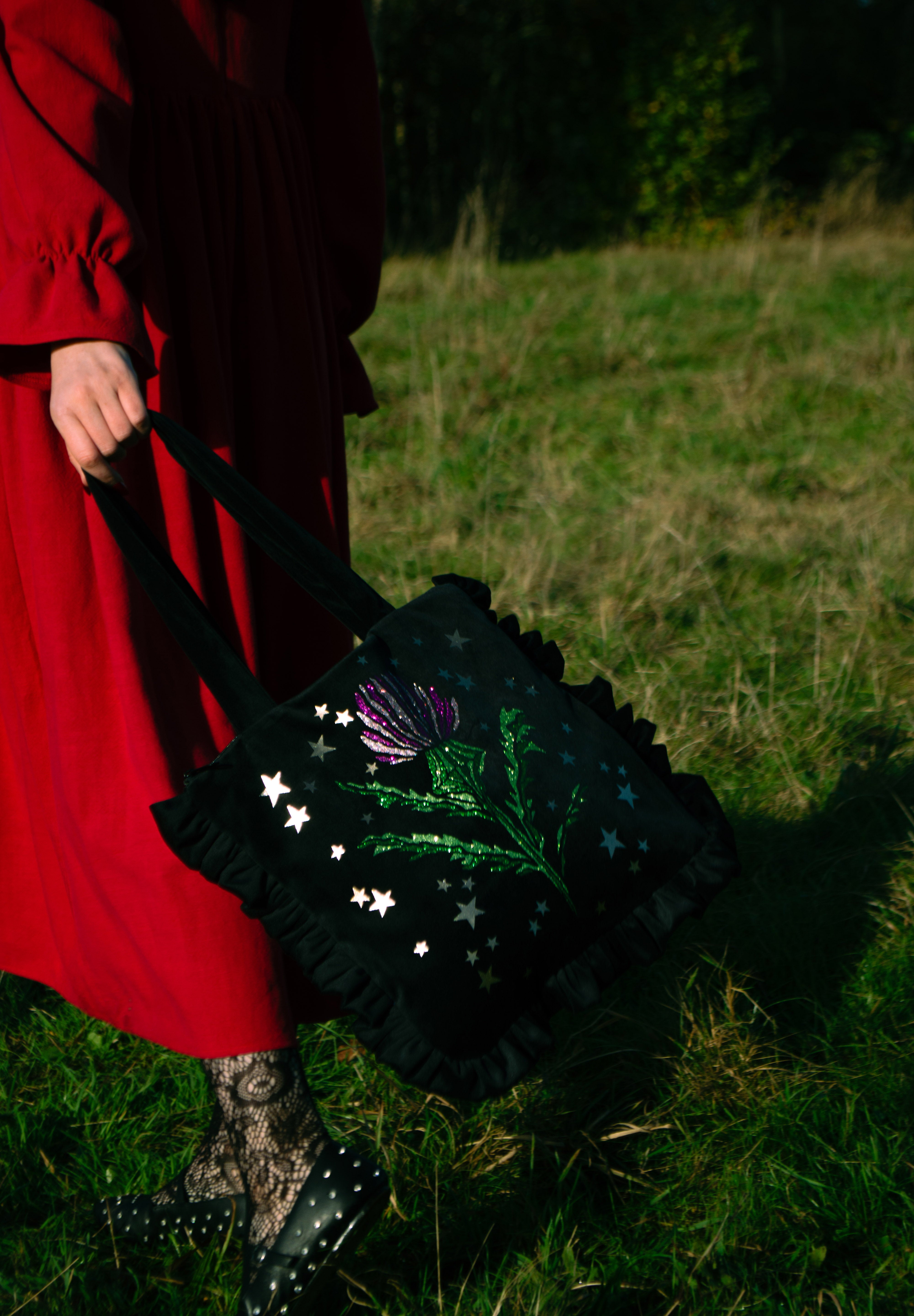 Adorned with delicate frills and a captivating shimmer, this bag beckons you to explore the hidden realms of your imagination. Adorned with Mary's iconic twinkling appliqués, luxurious velvet caresses your fingertips, while the fully lined interior and dual pockets offer both form and function.