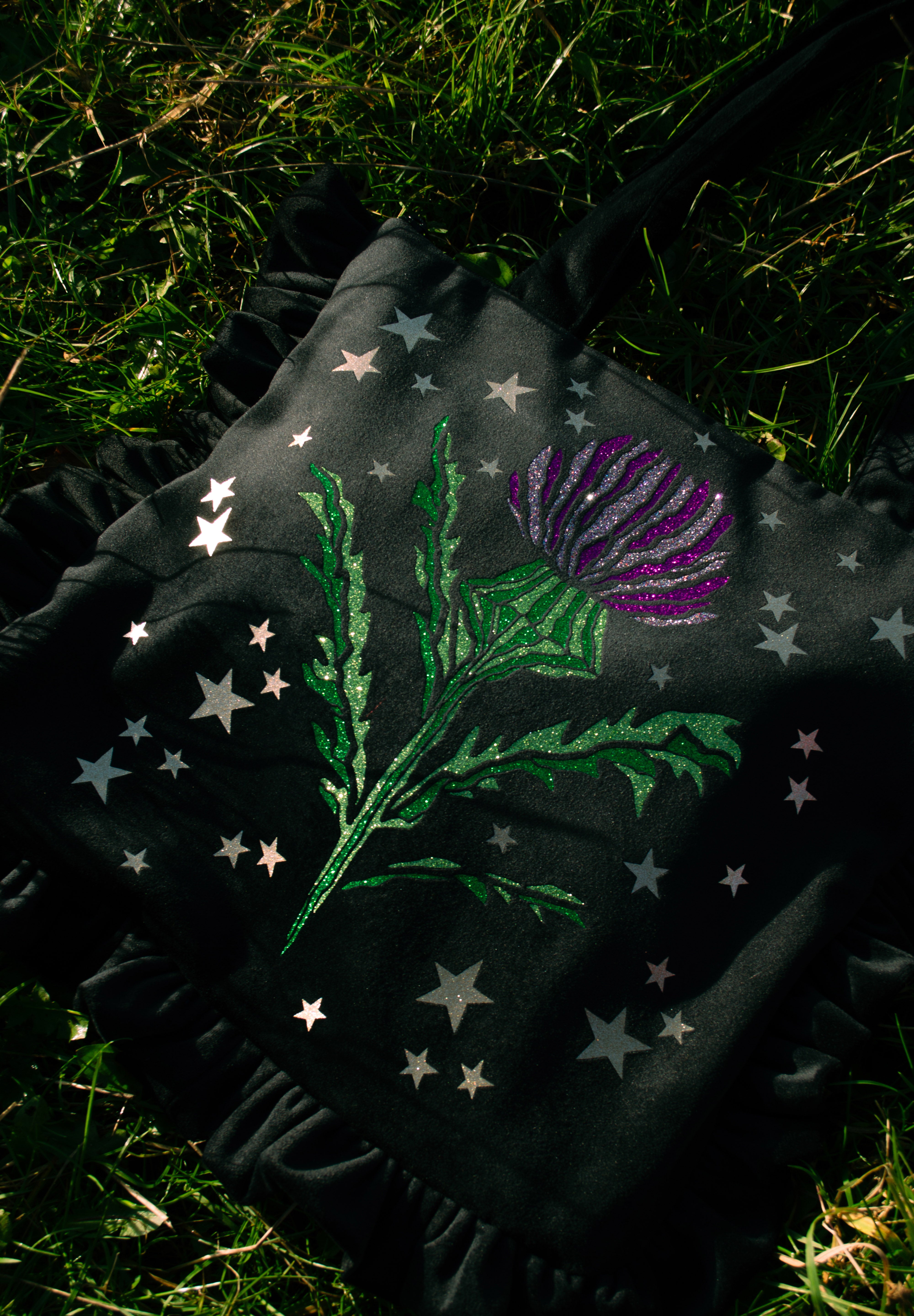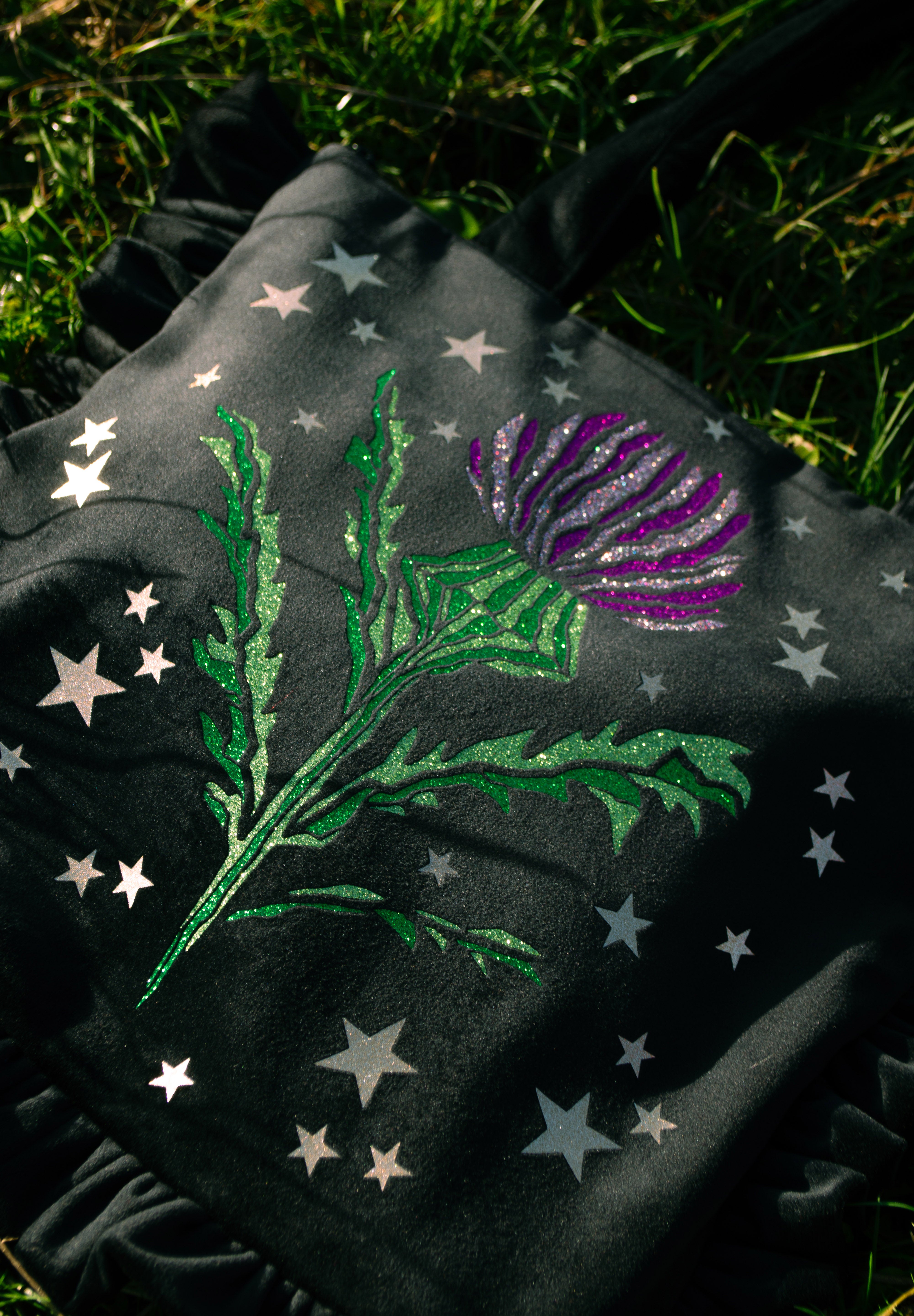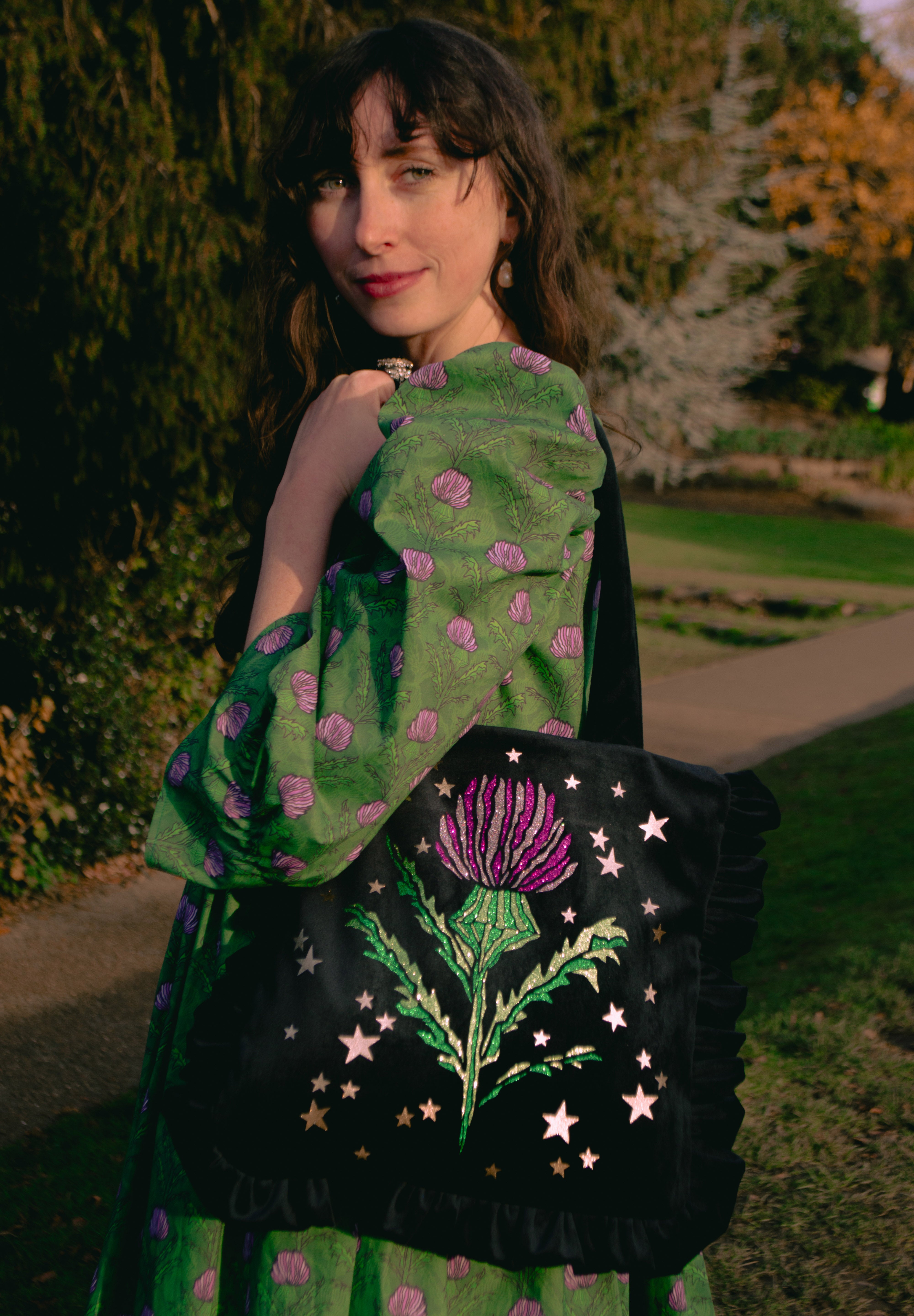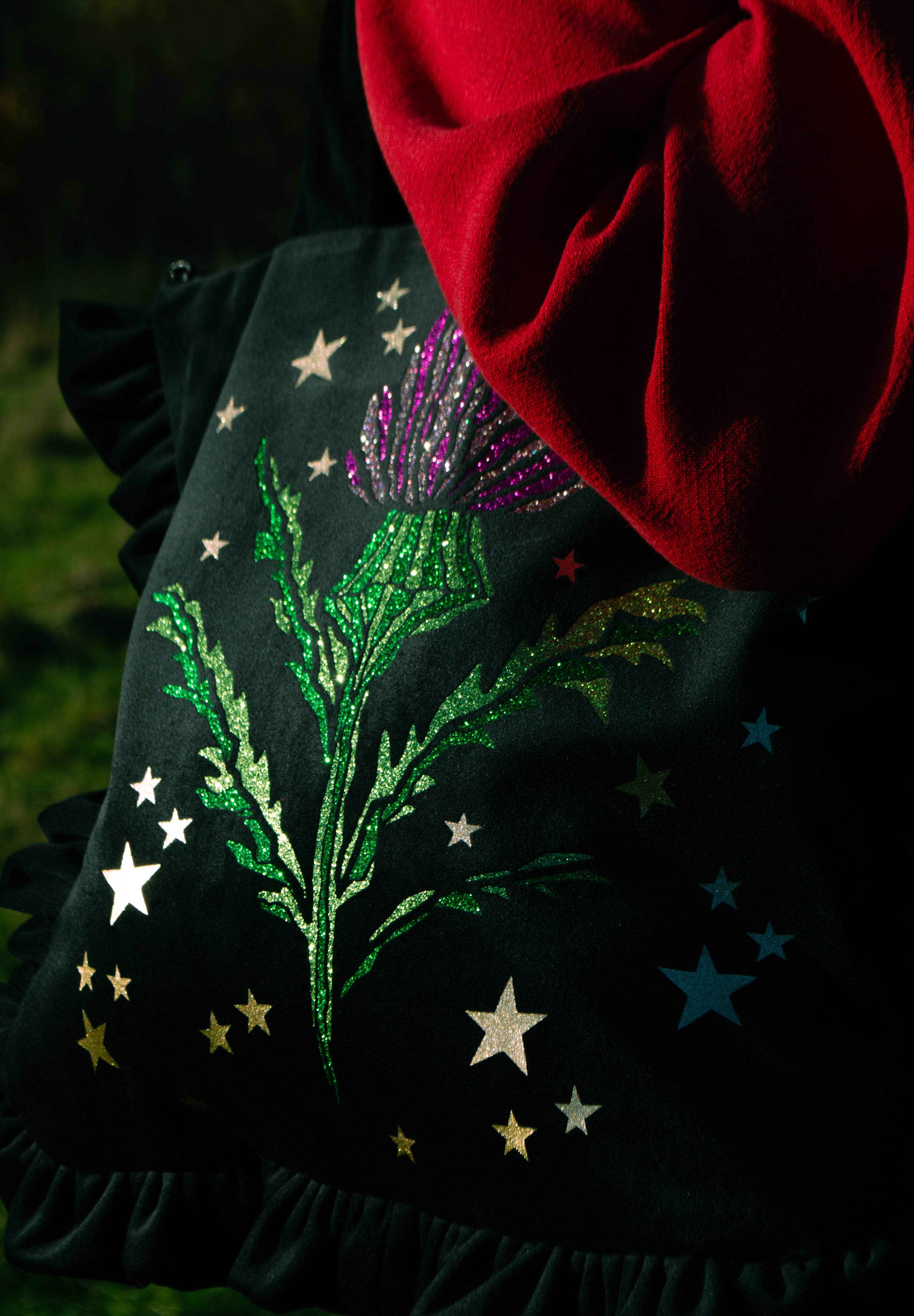 Adorned with delicate frills and a captivating shimmer, this bag beckons you to explore the hidden realms of your imagination. Adorned with Mary's iconic twinkling appliqués, luxurious velvet caresses your fingertips, while the fully lined interior and dual pockets offer both form and function.